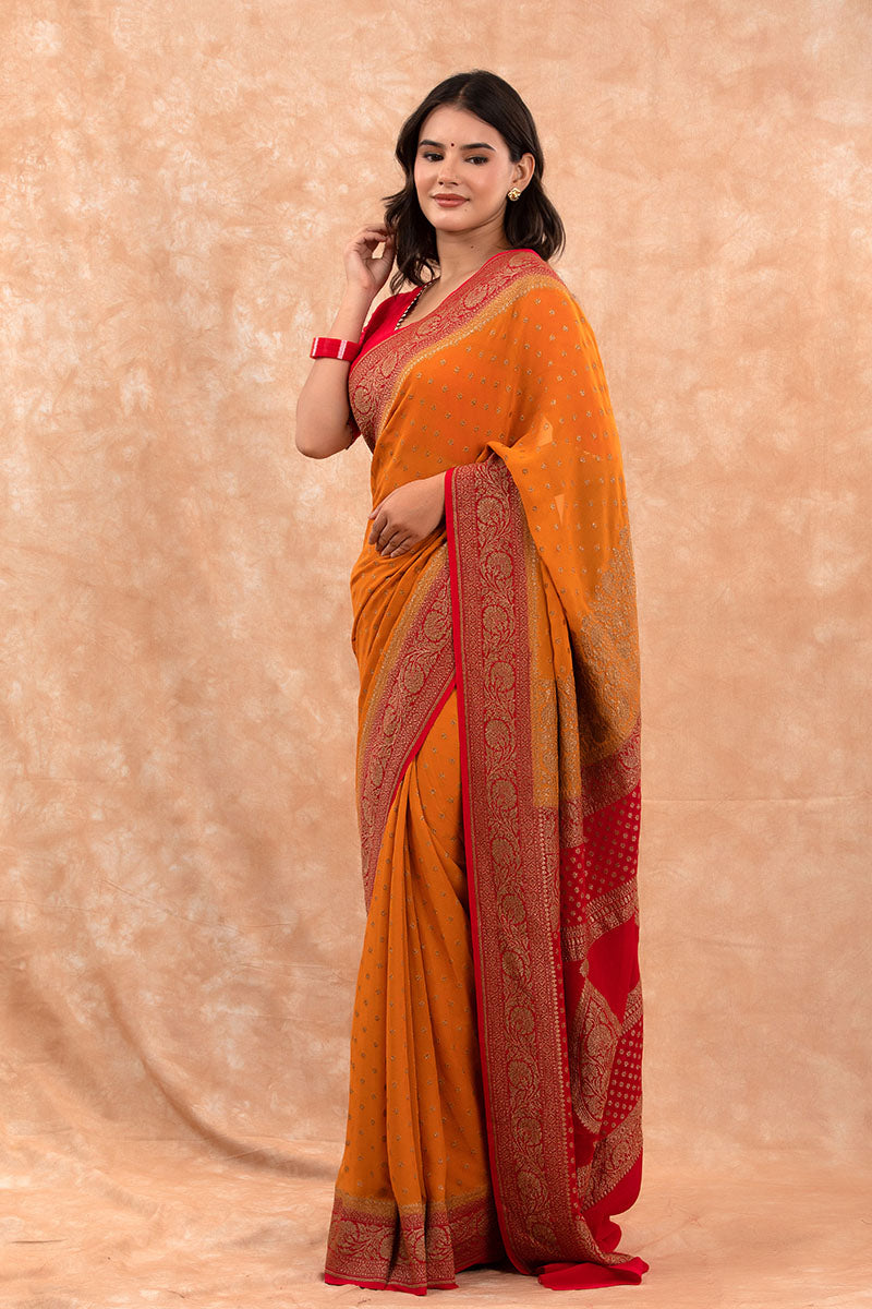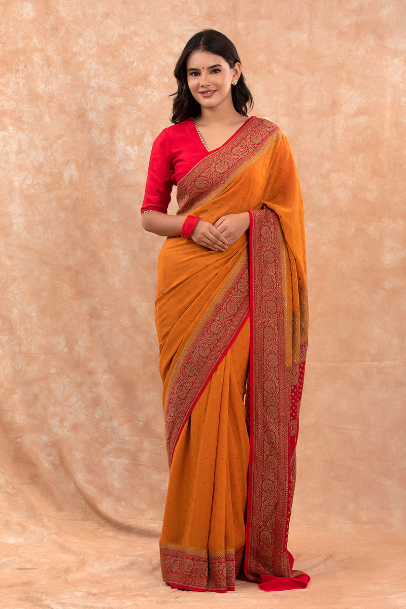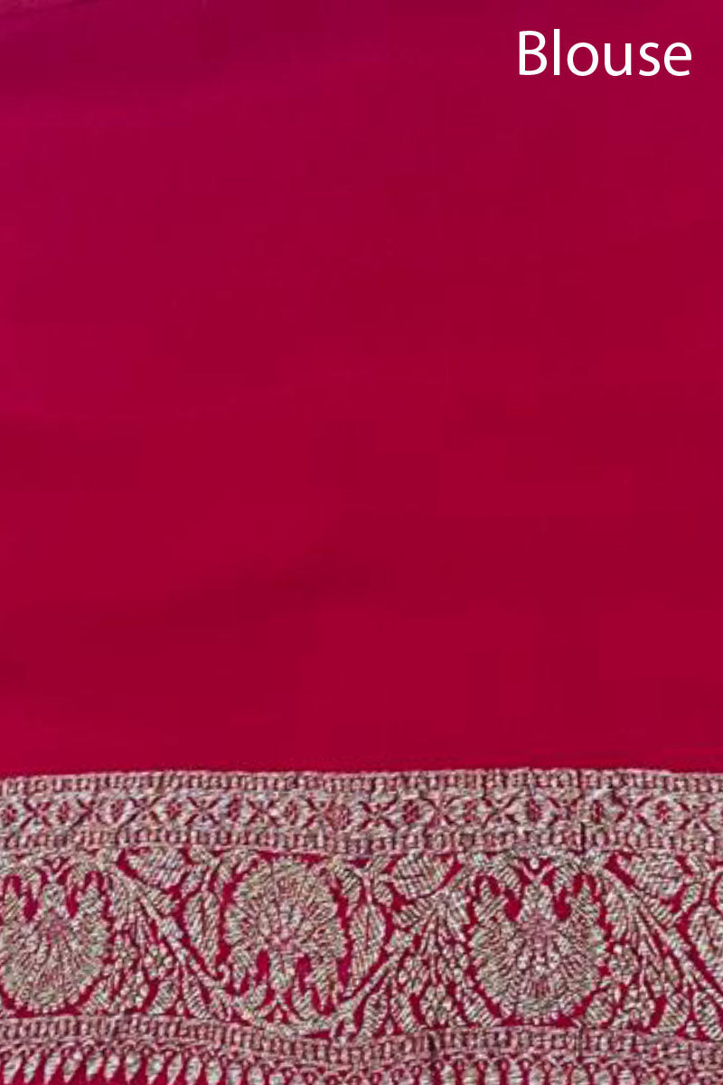 Features – The antique zari buta all over the saree along the contrast border in vibrant hues are the highlights of this pure georgette silk saree.