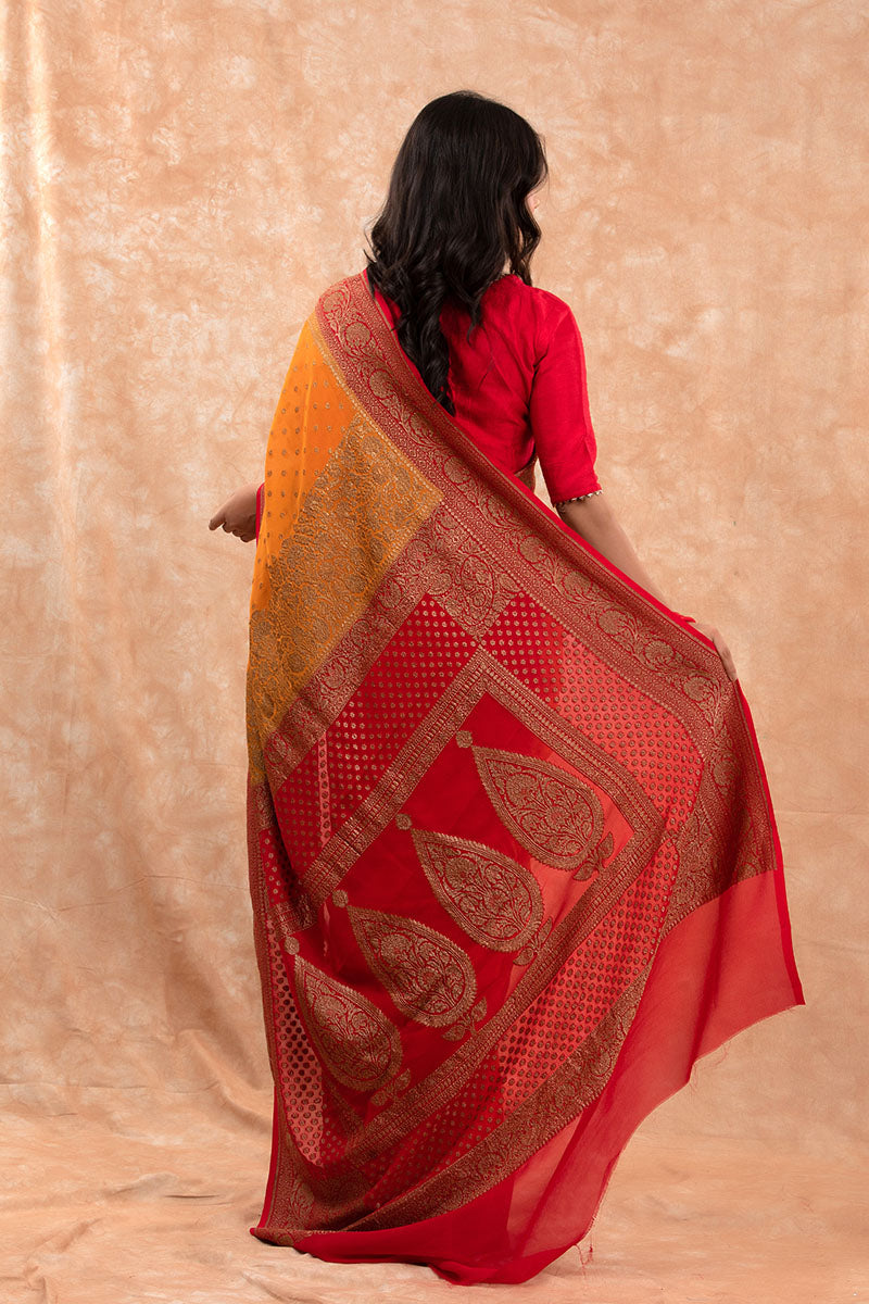 Soak this lovely georgette silk saree in a vibrant Yellow shade. The pure silk saree is magnified with woven antique zari buta throughout the bodice. The contrast weaved border adds to the saree’s attractiveness. It’s a fantastic attire for summer weddings or get-togethers because of the combination of the yellow shade and the contrast border. A contrast blouse piece is included in the saree, which is not sewn. Now is the time to make room in your closet for this gorgeous attire!