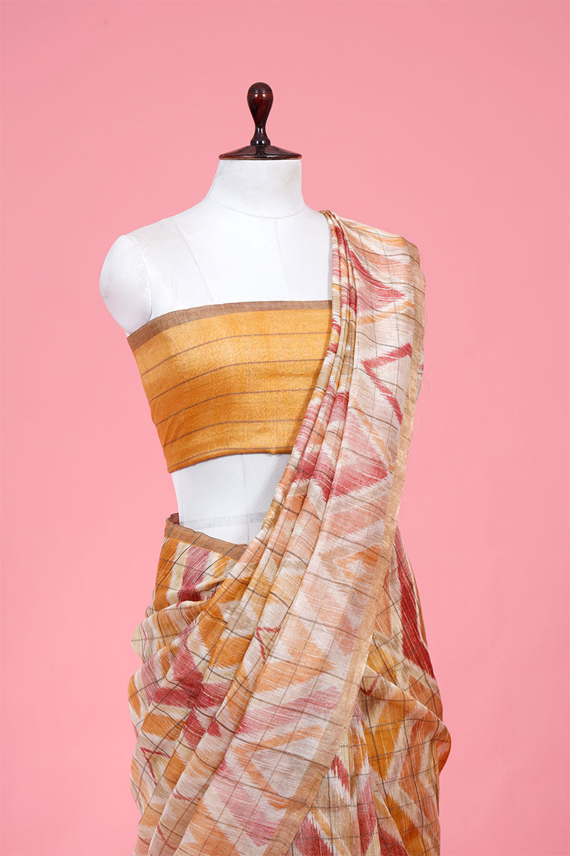Be the center of attraction at any event by wearing this Mustard Yellow & Red block printed saree. Tailored to sartorial perfection from premium-quality pure linen fabric, it assures a soft and soothing touch against the skin. The block printed geometrical motifs all over the saree, along with antique woven checks all over comes with zari woven border & pallu, making it a bewitching choice. A matching unstitched blouse piece is also included with this saree. Statement jewelry is always a great idea for the perfect traditional look. Wear bold makeup with nude lips and carry an embroidered clutch to balance the entire look.