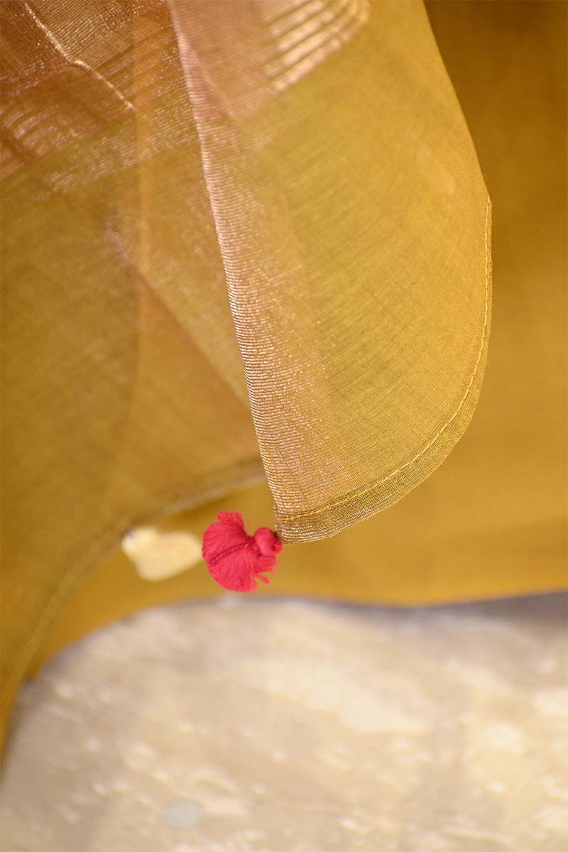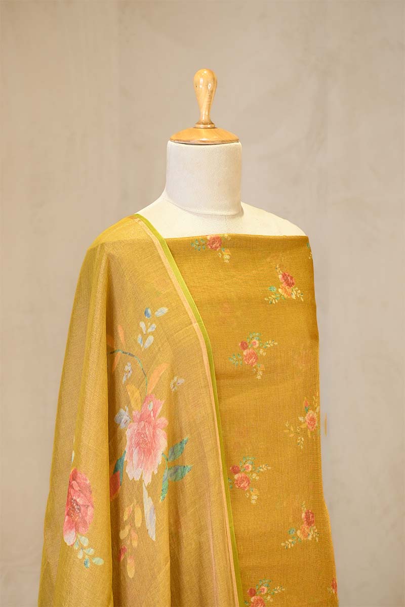 This mustard yellow tissue salwar suit set features digitally printed floral buta designs scattered all over the kurta, lending it a soft and charming appeal. The set is complemented with a matching floral printed linen dupatta that enhances the overall look. It is paired with a plain cotton silk bottom pant, making this dress material a comfortable yet refined choice for casual or semi-formal wear.