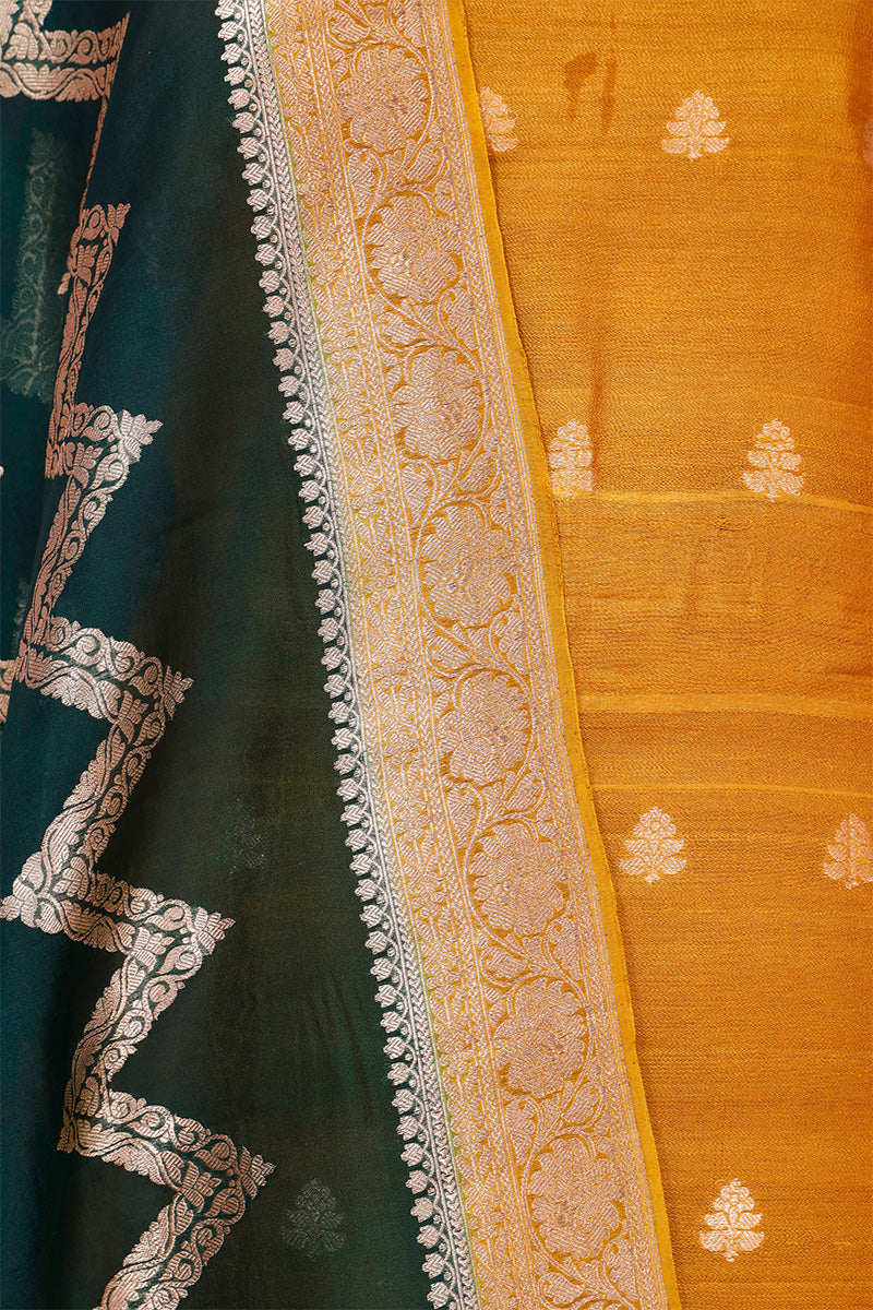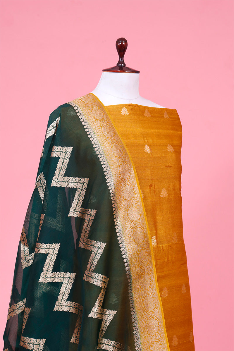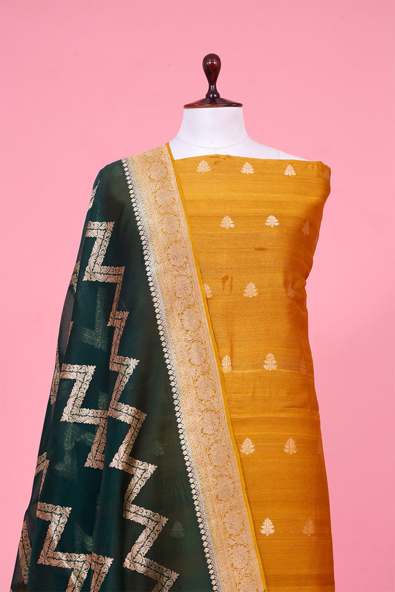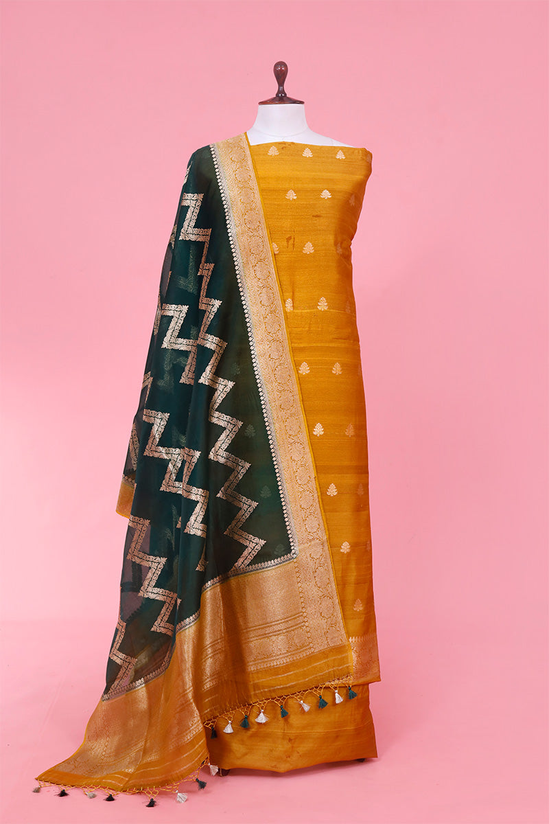 This mustard yellow Tussar silk suit piece is a vibrant and elegant choice for festive and wedding occasions. The kurta is adorned with intricate gold Kadhwa woven floral buta and features a detailed border, making it a timeless addition to your collection.