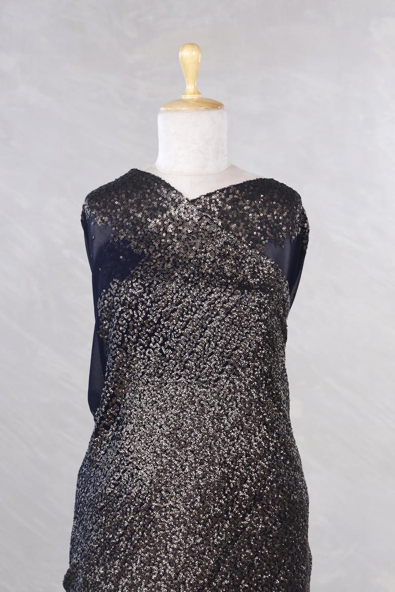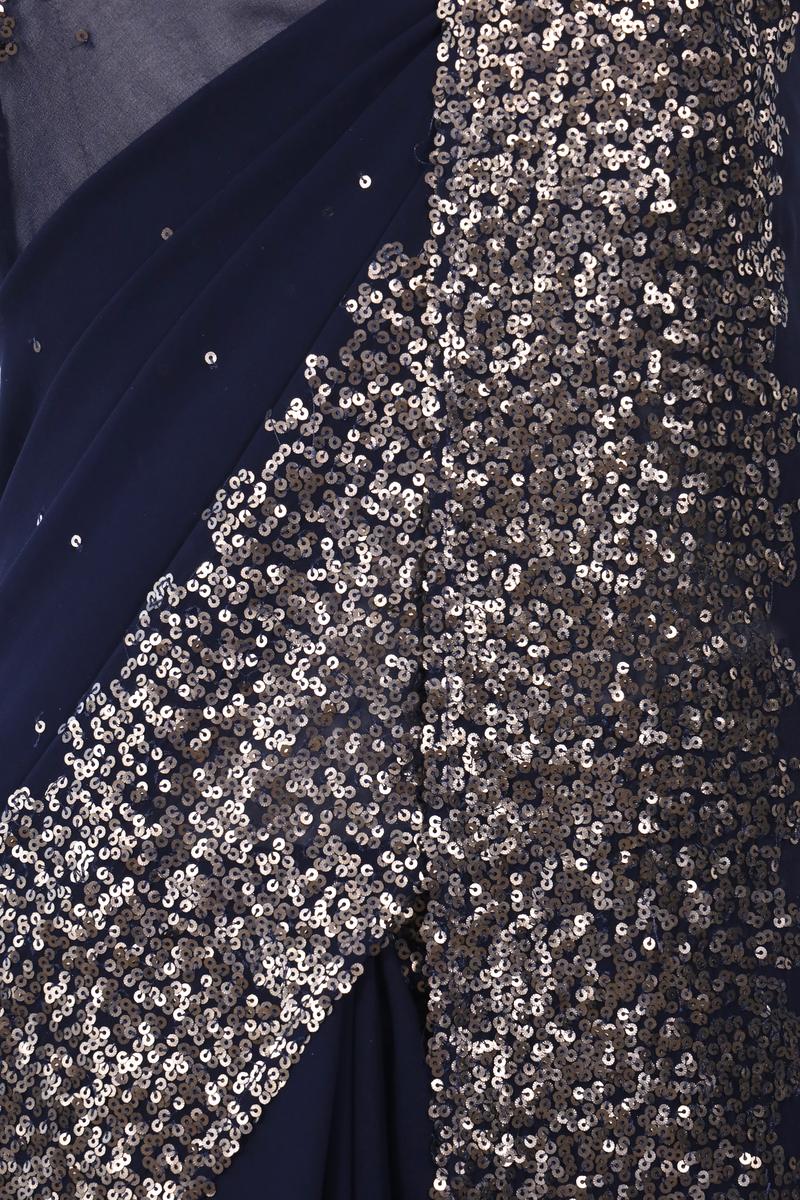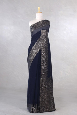 This Navy Blue Banarasi chiffon saree is a popular option among Bollywood celebrities, designed for parties and events. It features sequin embellishment buti all over the body, with matching sequin detailing on the border and pallu. The lightweight drape and refined shimmer make it a top choice for red carpets, evening parties, and high-profile gatherings. It comes with a matching unstitched blouse piece to complete the look.