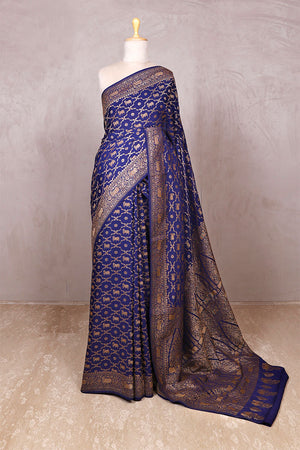 This navy blue crepe Banarasi khaddi silk saree is handloom woven with an intricate gold zari Pichwai floral jaal spread across the body, showcasing delicate detailing. The border and pallu have gold zari woven Pichwai floral patterns. It comes with a matching unstitched blouse piece, for customized tailoring.