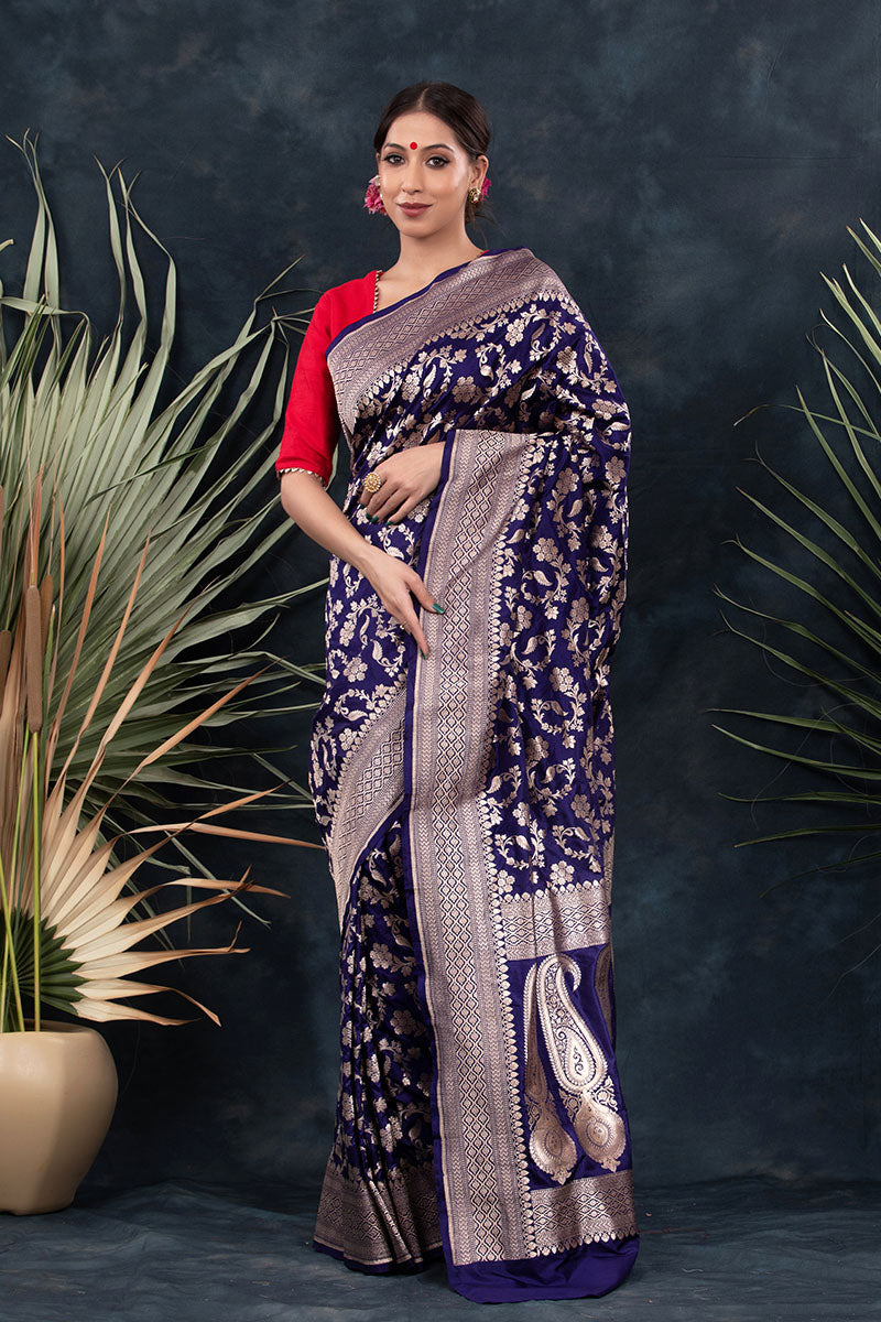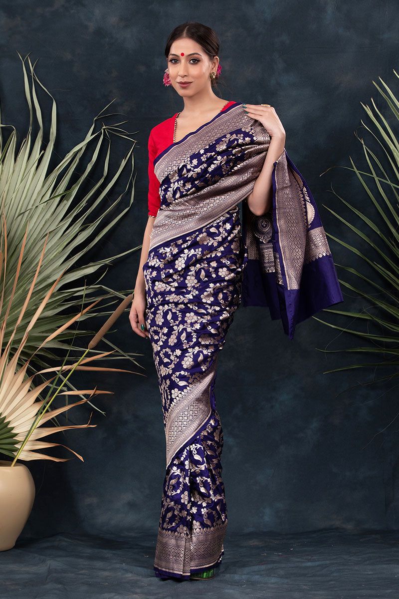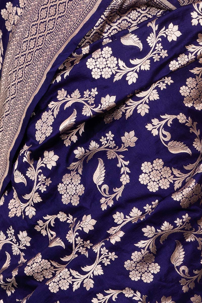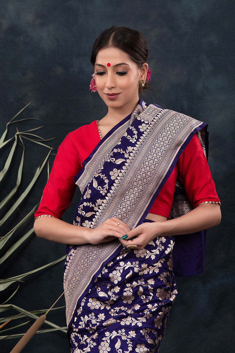 Stunning and unique, this navy blue handwoven Banarasi silk saree is an exceptional addition to your wardrobe. Perfect for wearing to special occasions, this saree exudes a special charm with its delicate floral jaal work, geometric border, and palla. Its lightweight fabric enables comfortable draping and creates an exquisite look when paired with statement earrings and a necklace.