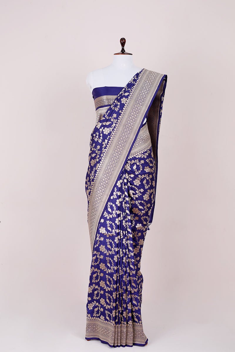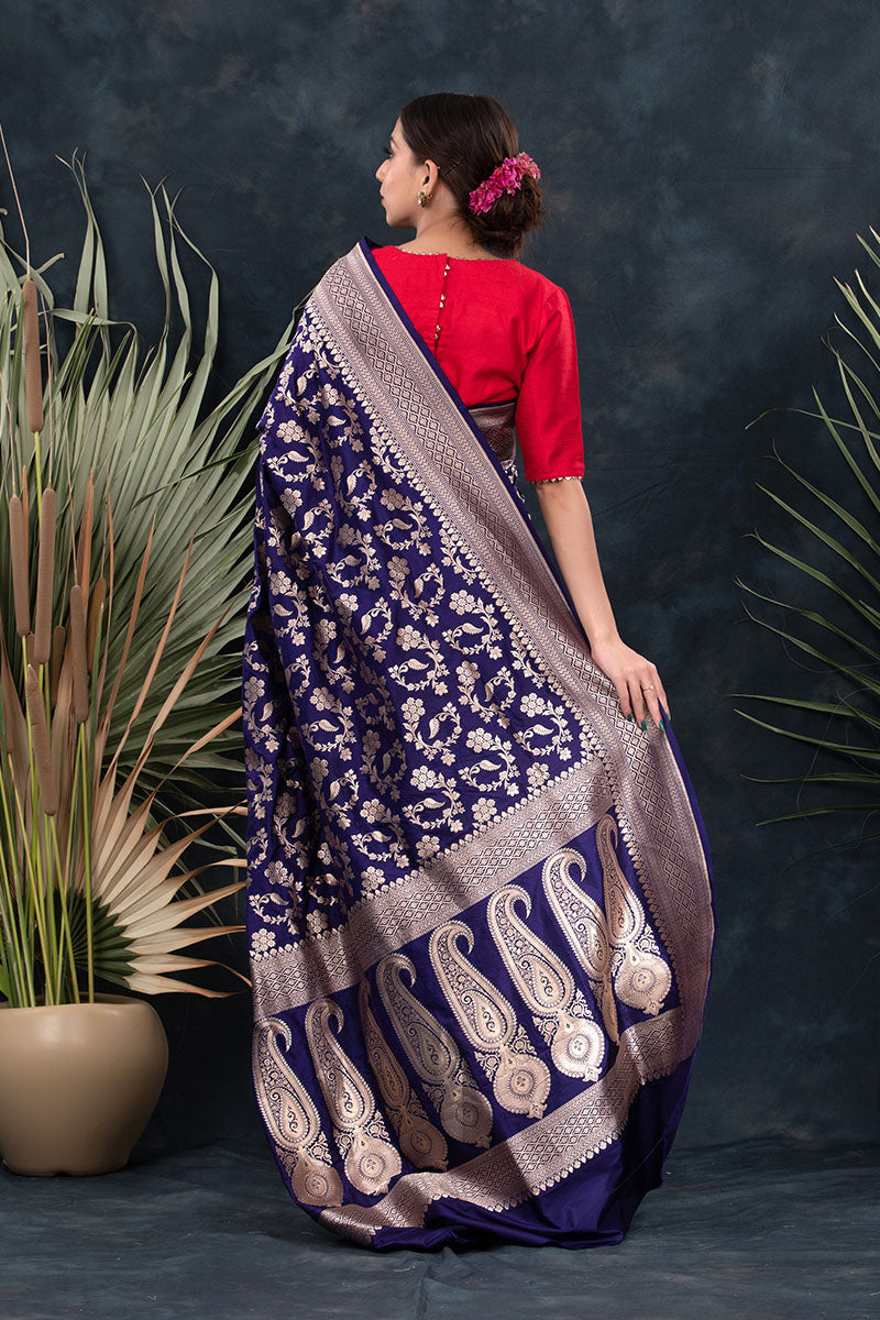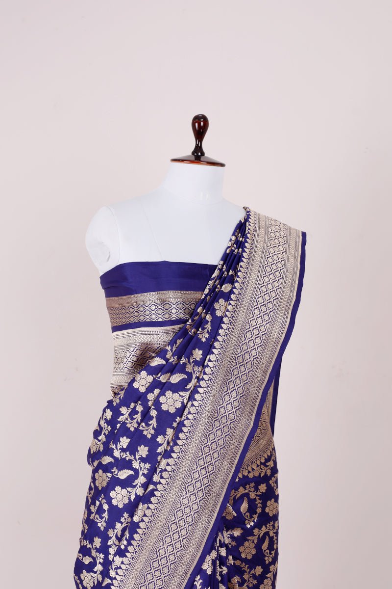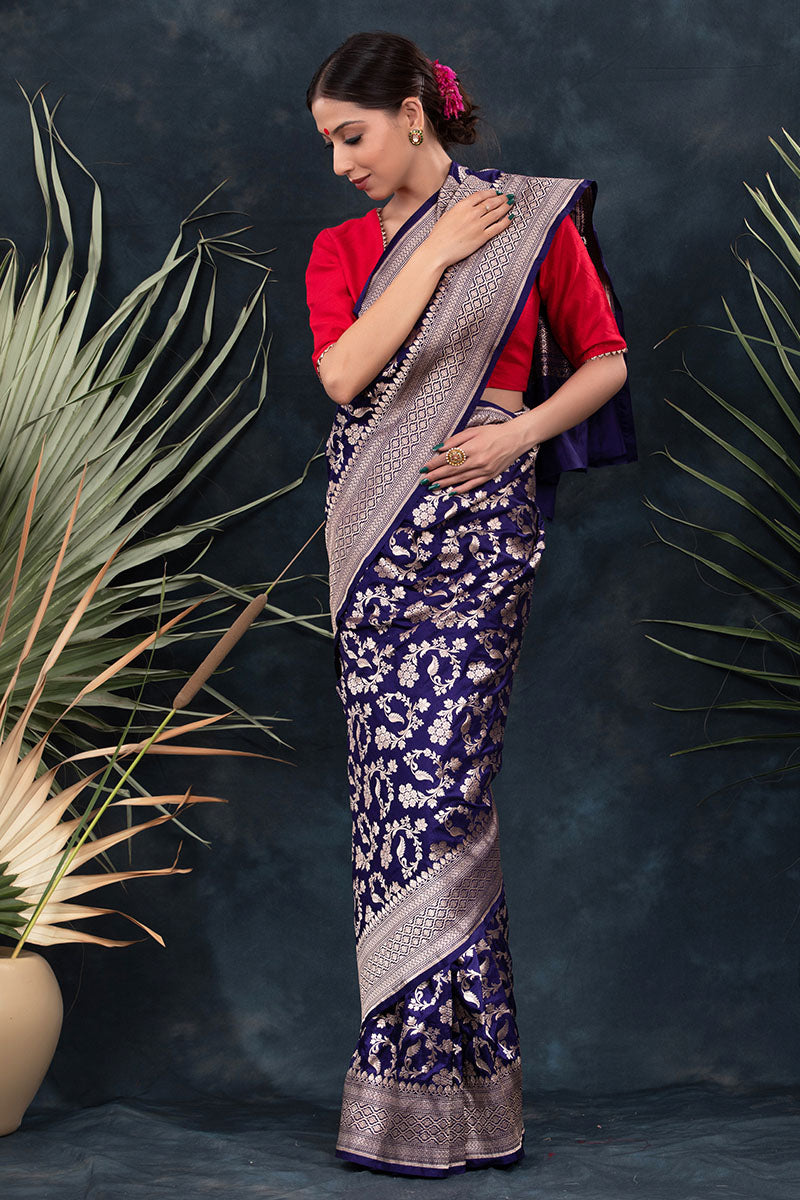 Stunning and unique, this navy blue handwoven Banarasi silk saree is an exceptional addition to your wardrobe. Perfect for wearing to special occasions, this saree exudes a special charm with its delicate floral jaal work, geometric border, and palla. Its lightweight fabric enables comfortable draping and creates an exquisite look when paired with statement earrings and a necklace.