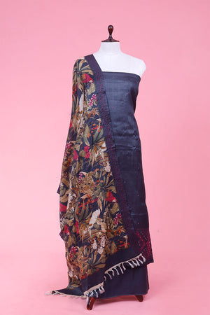 - This Navy Blue Unstitched Suit Set Is In Tussar Silk fabric.