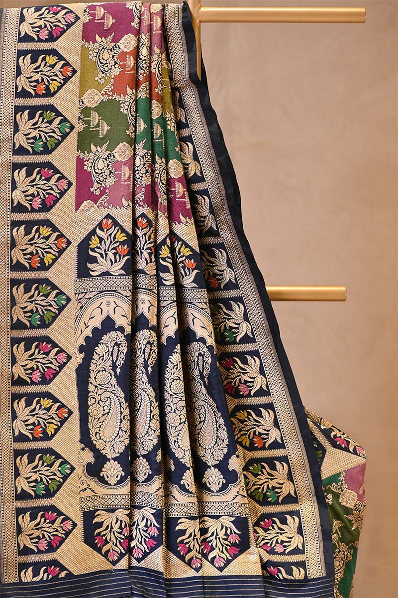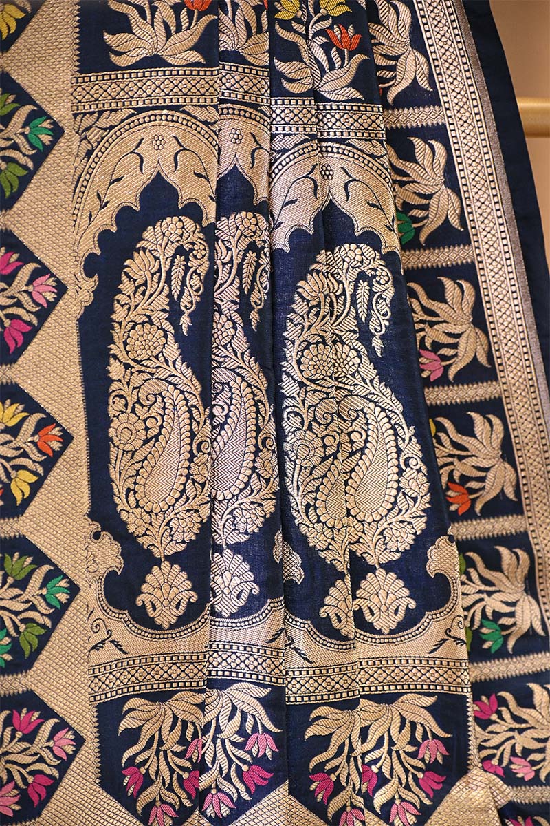 This Navy Blue Banarasi saree features a beautiful rangkat pattern, elegantly adorned with water gold zari jaal woven designs that flow across the saree, border, and pallu. The intricate detailing adds a touch of sophistication to this traditional piece. It comes with an unstitched blouse piece, allowing for personalized styling.