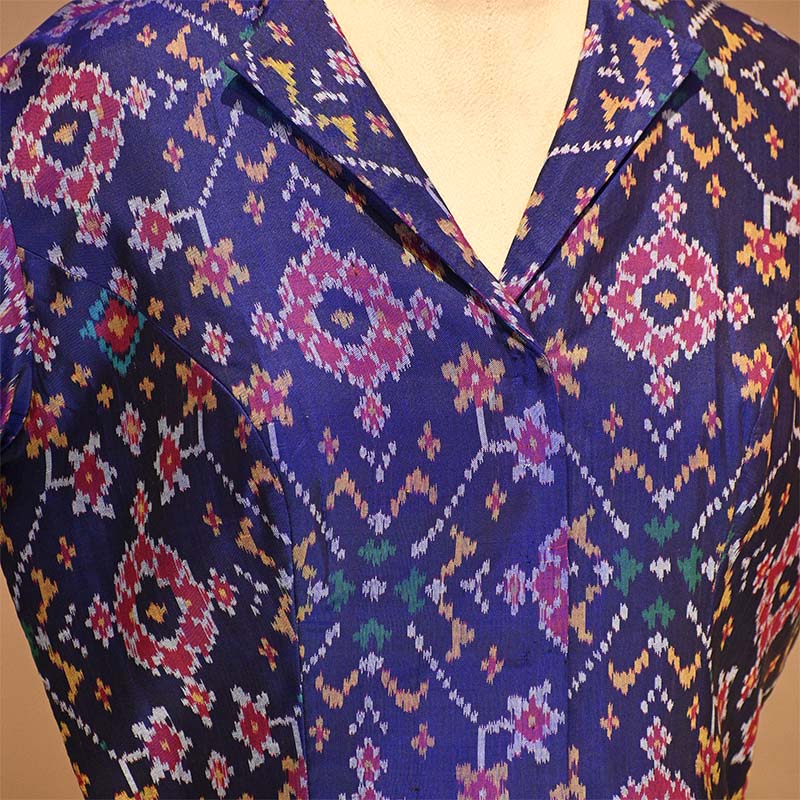 Introducing our Patola Blouse, a celebration of heritage and style. Adorned with mesmerizing printed Patola motifs inspired by Indian tradition, this blouse exudes elegance. Featuring a sophisticated collared neckline and chic half sleeves, it effortlessly blends classic charm with modern flair. Perfect for adding a touch of cultural richness to any ensemble, it's a versatile choice for every occasion.