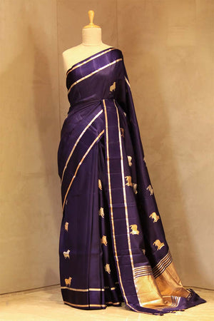 This navy blue Banarasi silk saree is a handloom masterpiece featuring gold and silver zari woven Pichwai Aghanya (cow) motifs across the body woven with pure Puna silk. The saree is accentuated with a silver and gold zari-striped border on a satin base and complemented by an ethnic brocade pallu. It comes with a matching unstitched blouse piece for custom styling.