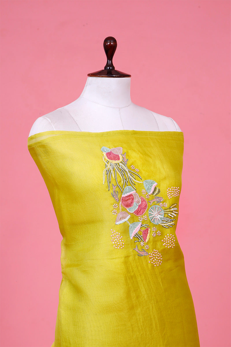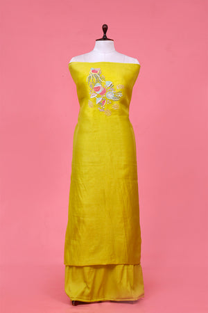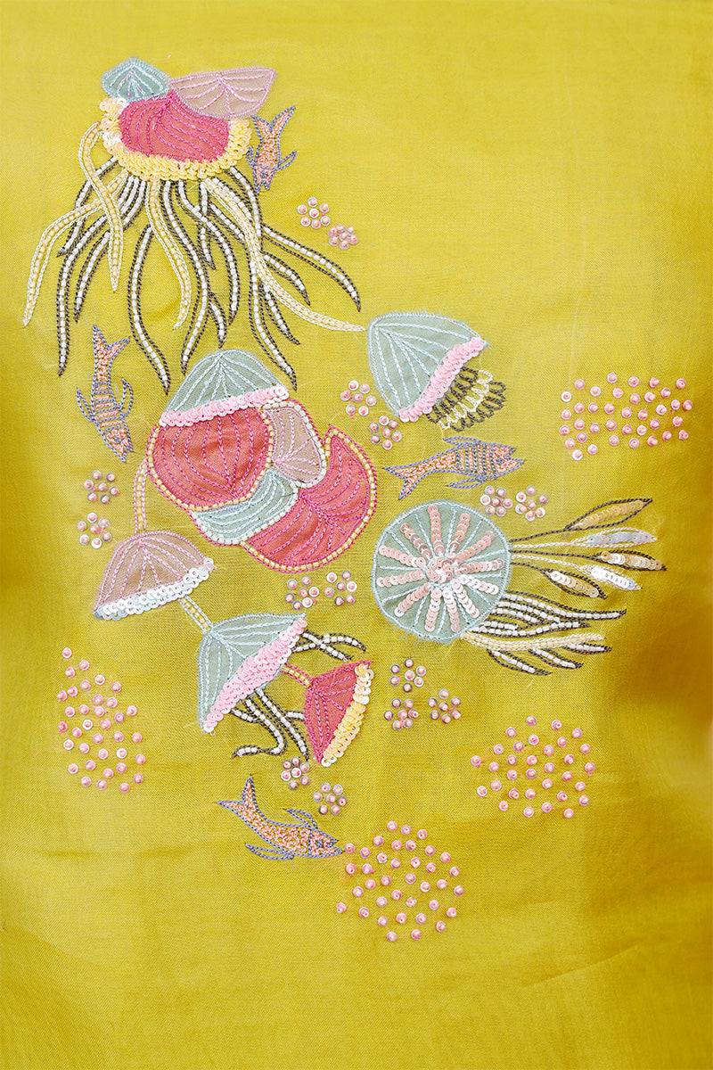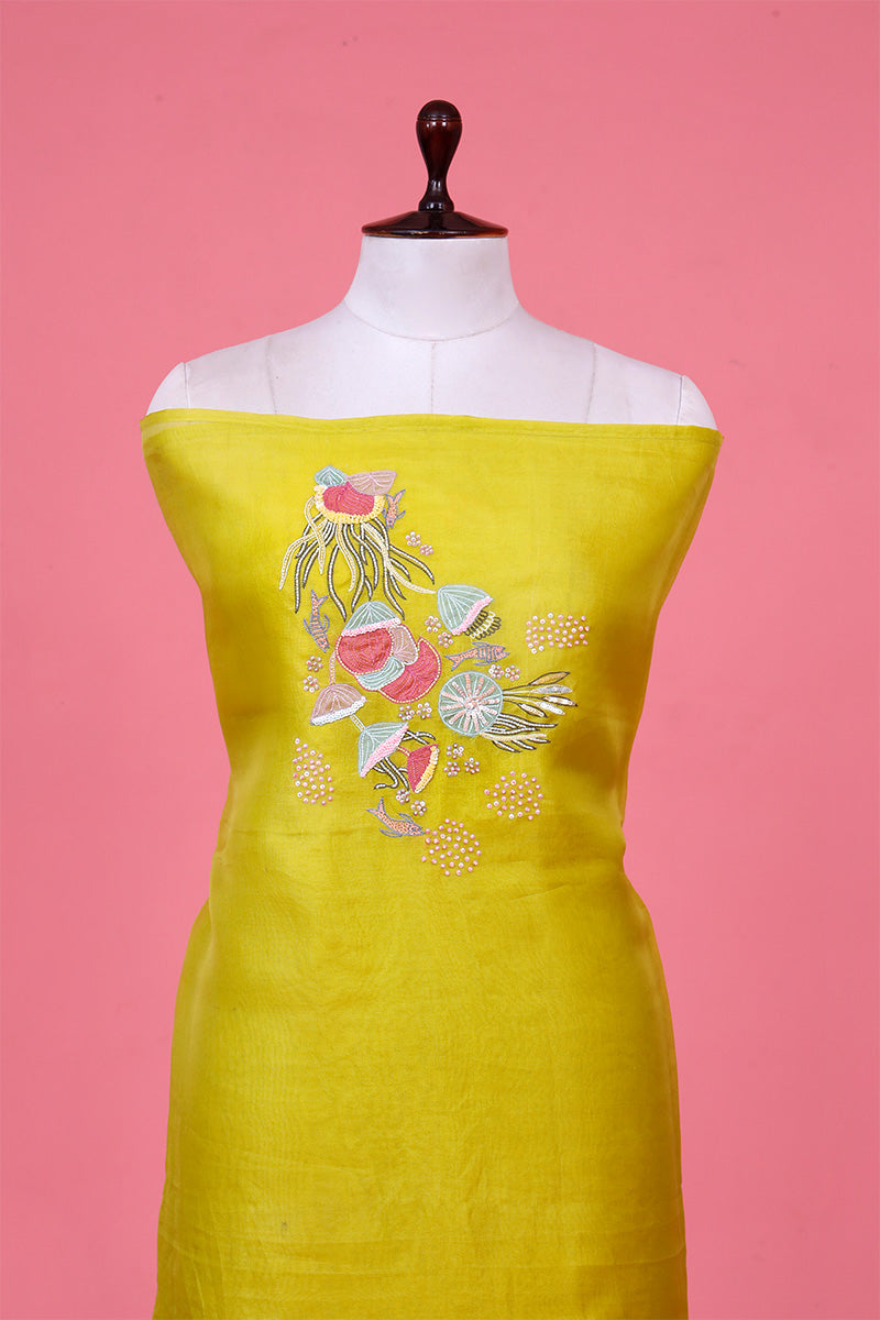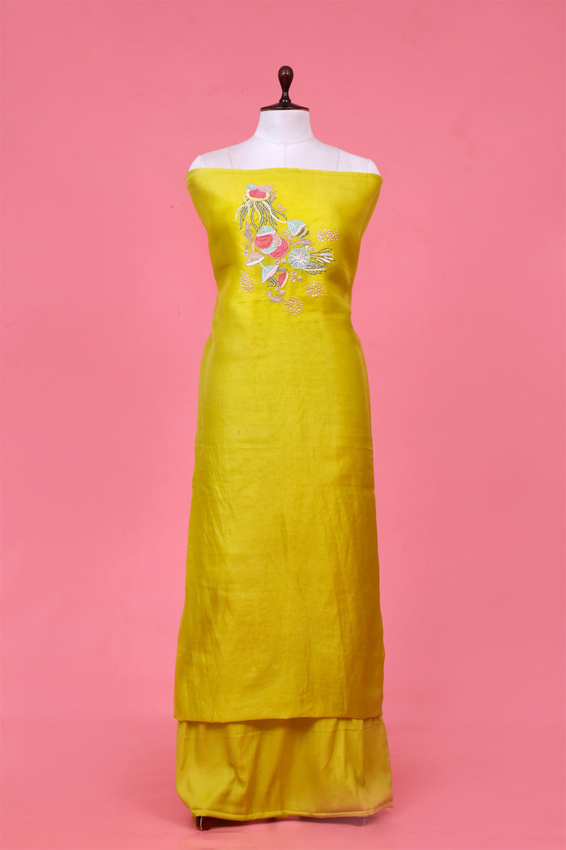 This neon green organza silk 2-piece suit set is a vibrant choice for festive and special occasions. The kurta is embellished with a hand-embroidered marine motif on the neckline, creating a stylish focal point. Paired with a coordinated bottom, this suit piece brings together modern design and elegance.