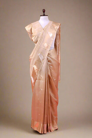 Elevate your style with this stunning piece from Chinaya Banaras. This handloom silk saree is perfect for any event, be it a cocktail party, wedding or any night function. Crafted from Banarasi silk fabric, it gives a soft and soothing touch against the skin. This saree is adorned with kadhwa-woven gold and silver zari motifs all over the saree along with gold and silver zari kadhwa-woven bird motifs on the border and pallu. Also, this saree comes with a matching woven unstitched blouse piece. Wear bold makeup and complement your saree by pairing it with diamond or silver jewellery with a metallic clutch.