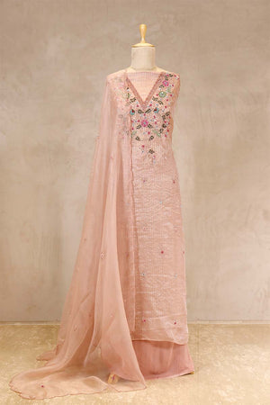 This nude pink embellished Banarasi tissue silk suit set is a perfect blend of tradition and modern elegance, making it ideal for festive occasions. The kurta features a V-shaped neckline with intricate floral hand embroidery and mirror work, complemented by embellished motifs throughout. Paired with an embellished organza silk dupatta adorned with a scalloped border and hand-embroidered buti, the set is completed with a plain silk matching pant for a polished finish.