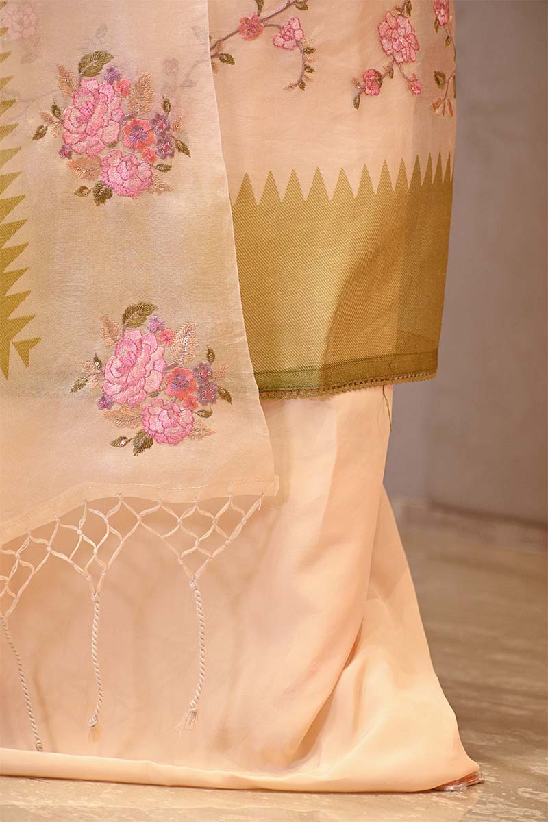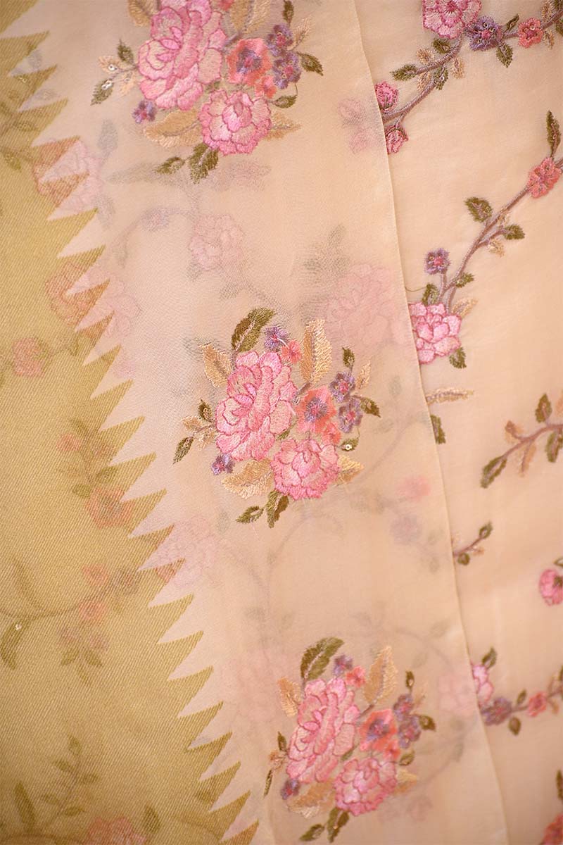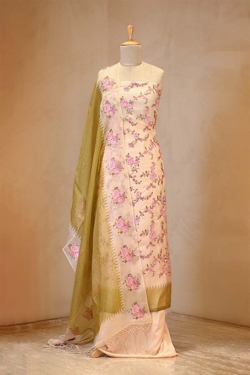 This off-white and Heena Green embroidered organza silk suit set is designed for festive occasions and cultural gatherings. The kurta features resham embroidered floral jaal all over and printed hemline, adding detailed patterns to the fabric. It is paired with a printed and embroidered dupatta and comes with a matching bottom pant, making this dress material a complete ensemble.