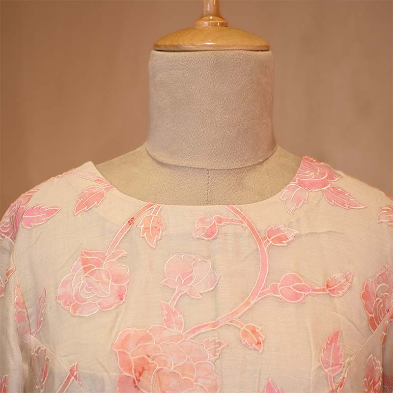 This off-white organza silk blouse is detailed with peach floral appliqué work spread across the fabric, offering a soft yet detailed design. It features a classic round neckline and half-sleeves with scalloped edges, making it suitable for pairing with light or pastel sarees on festive and special occasions.