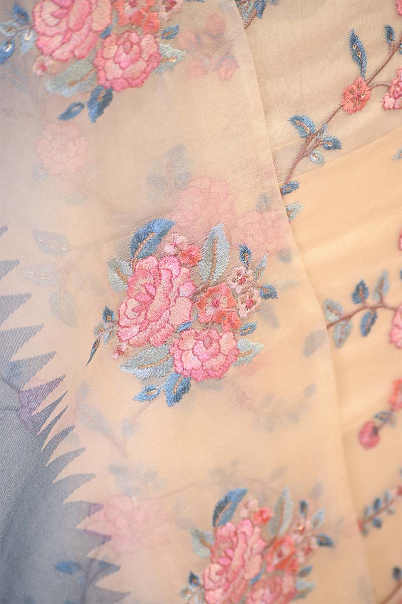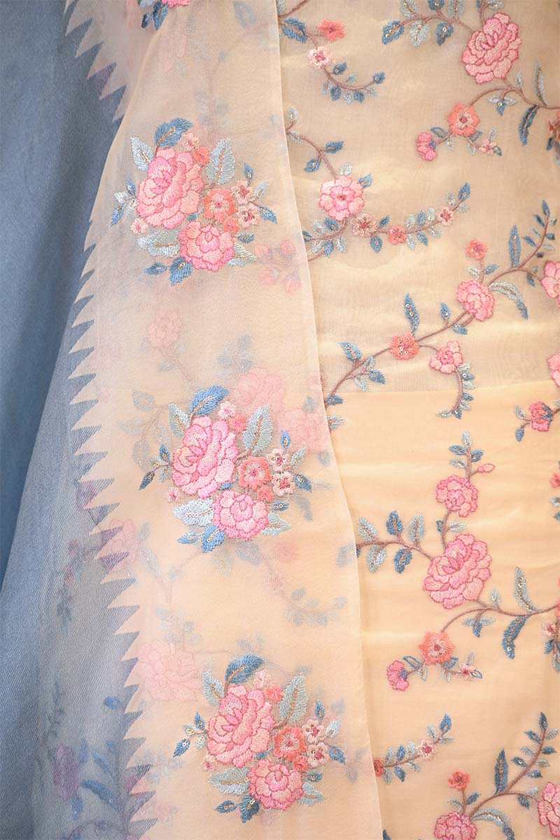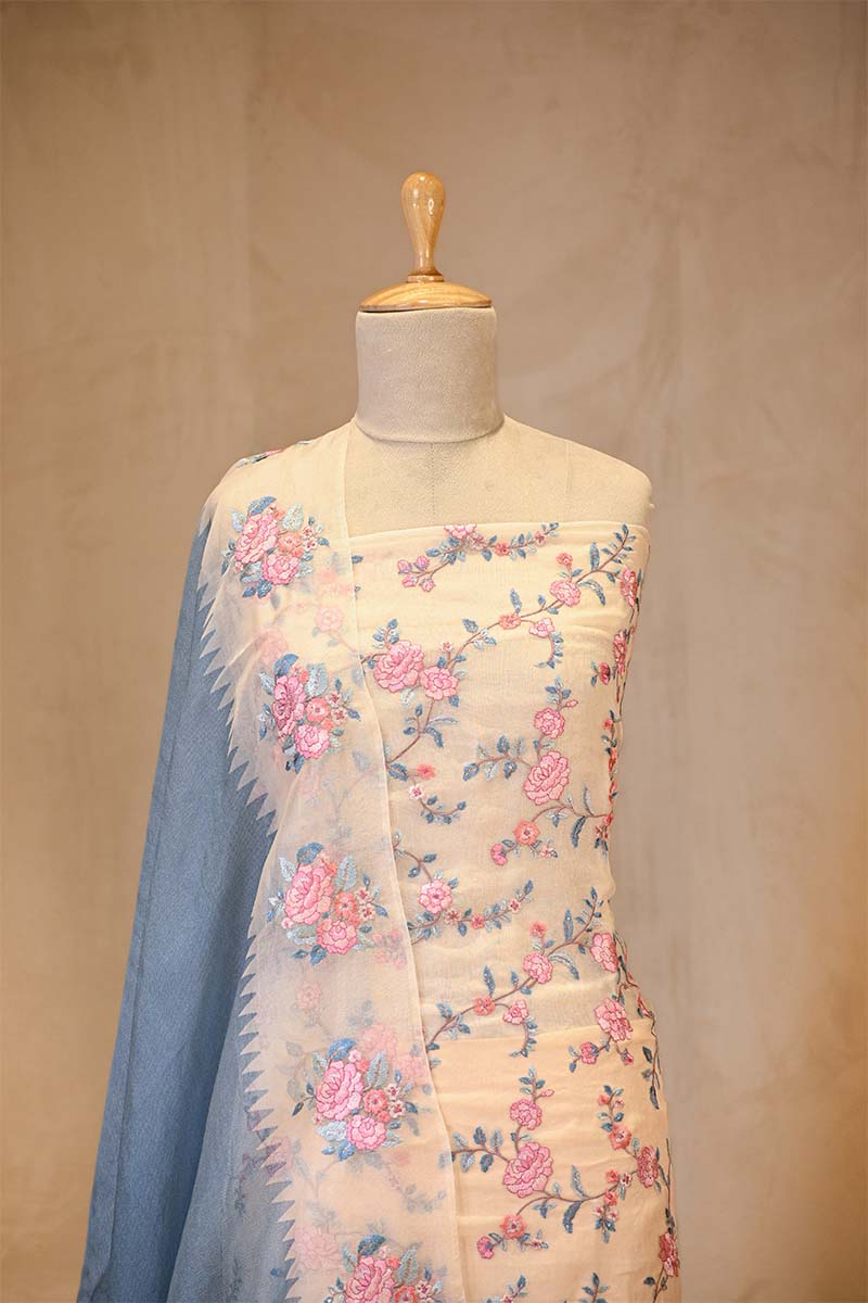 This off-white and Blue embroidered organza silk suit set is designed for festive occasions and cultural gatherings. The kurta features resham embroidered floral jaal all over and printed hemline, adding detailed patterns to the fabric. It is paired with a printed and embroidered dupatta and comes with a matching bottom pant, making this dress material a complete ensemble.