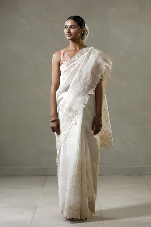 This off white organza silk saree features delicate resham-woven floral buti combined with sequin work spread across the body. The highlight lies in its intricately crafted scalloped border, adorned with applique work and subtle embellishments for added texture. It is paired with an embroidered golden tissue silk blouse piece that complements the overall look beautifully.