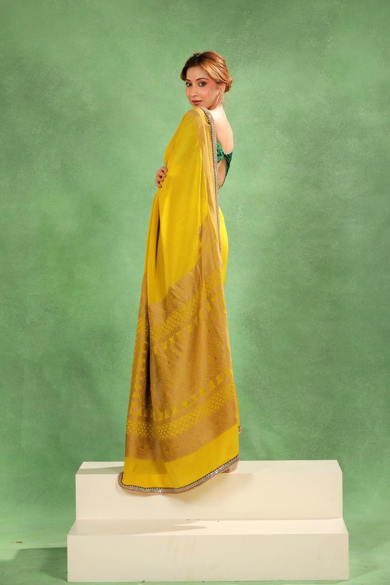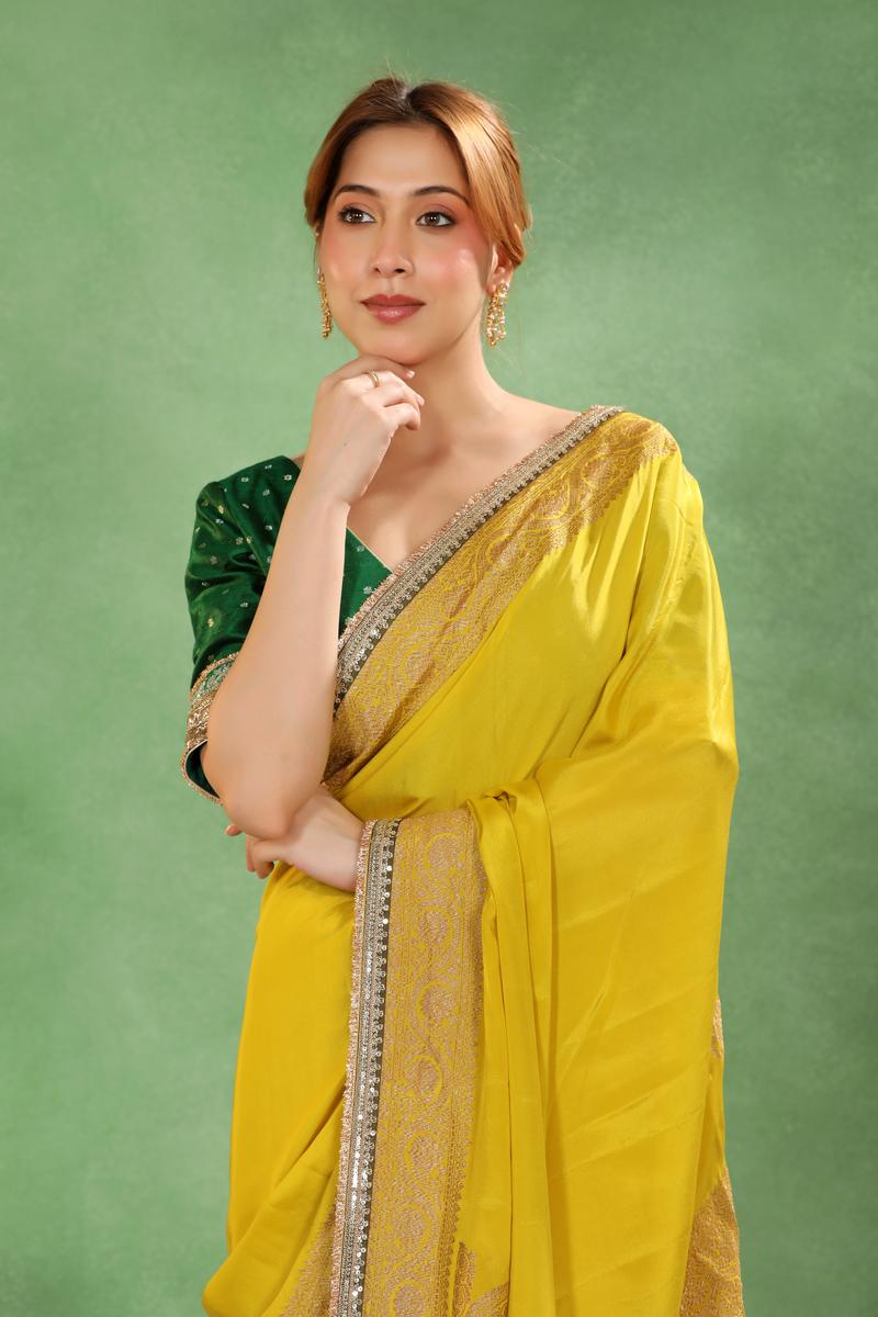This Olive Yellow Crepe Silk Saree features a delicate floral antique zari woven border, with the corner adorned with a traditional Konia design. The pallu is highlighted with an antique zari woven floral pattern. It comes with a matching unstitched blouse piece to complete the look.