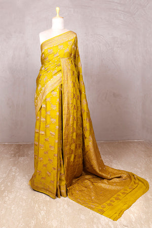 This chartreuse green color handloom crepe khaddi silk Banarasi saree features finely woven Pichwai motif butas across the body, adding a cultural and artistic touch. The saree is further adorned with a floral gold zari woven border and pallu, enhancing its traditional appeal. It comes with a matching unstitched blouse piece, allowing for customized styling.