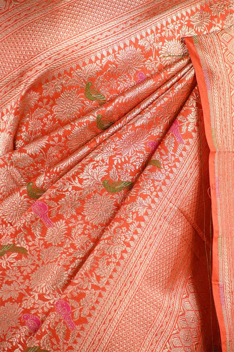 This orange pure Banarasi katan silk saree is woven with an intricate gold zari floral brocade pattern, complemented with pink and green meenakari bird motifs across the body. The pallu features gold zari woven floral designs and small paisley patterns while the vordr is woven with zari brocade pattern. It is paired with a matching plain unstitched blouse piece finished with a zari woven border.