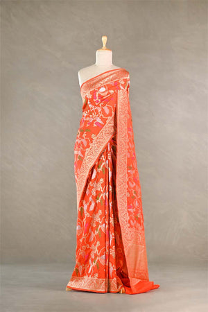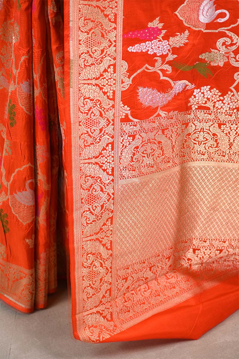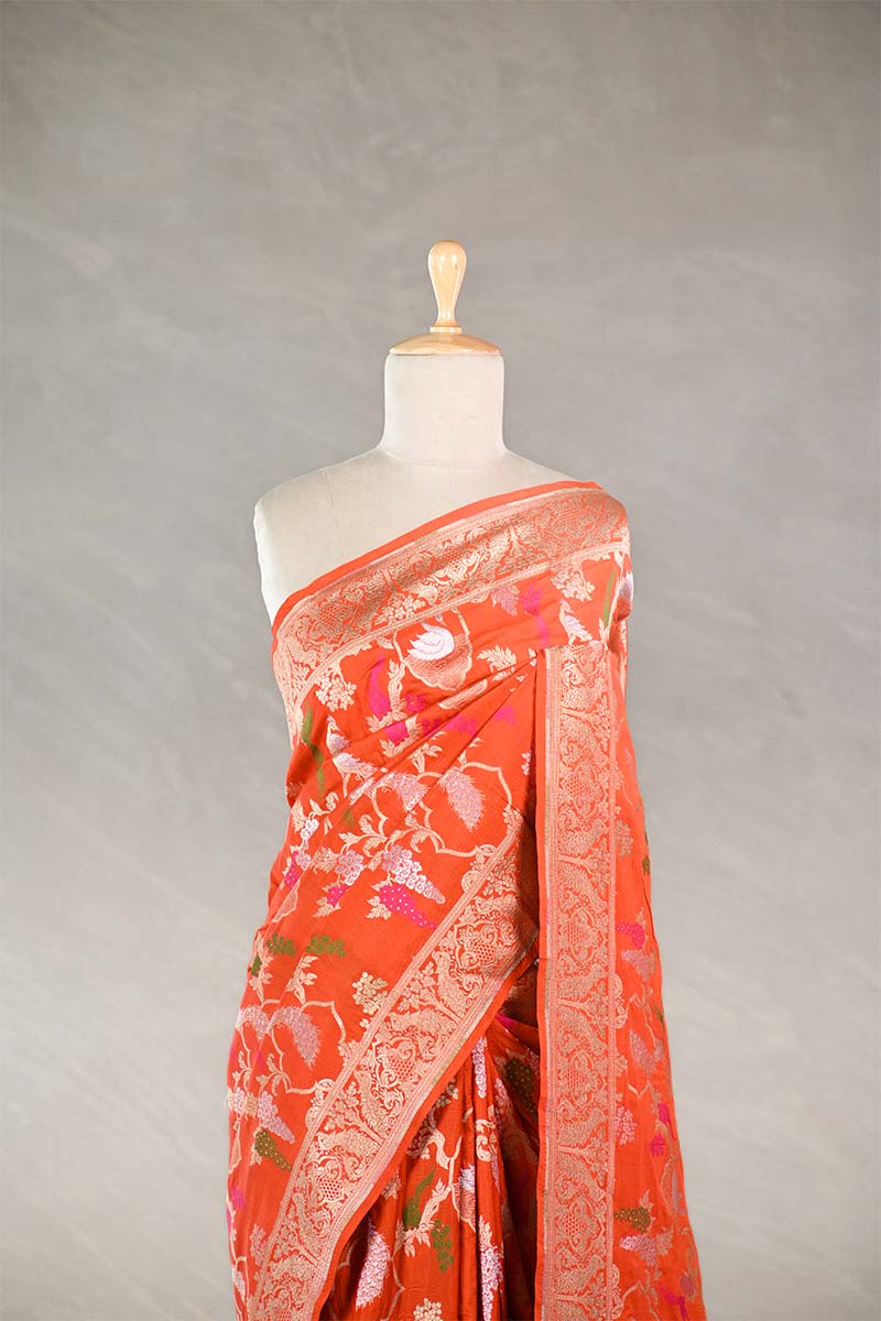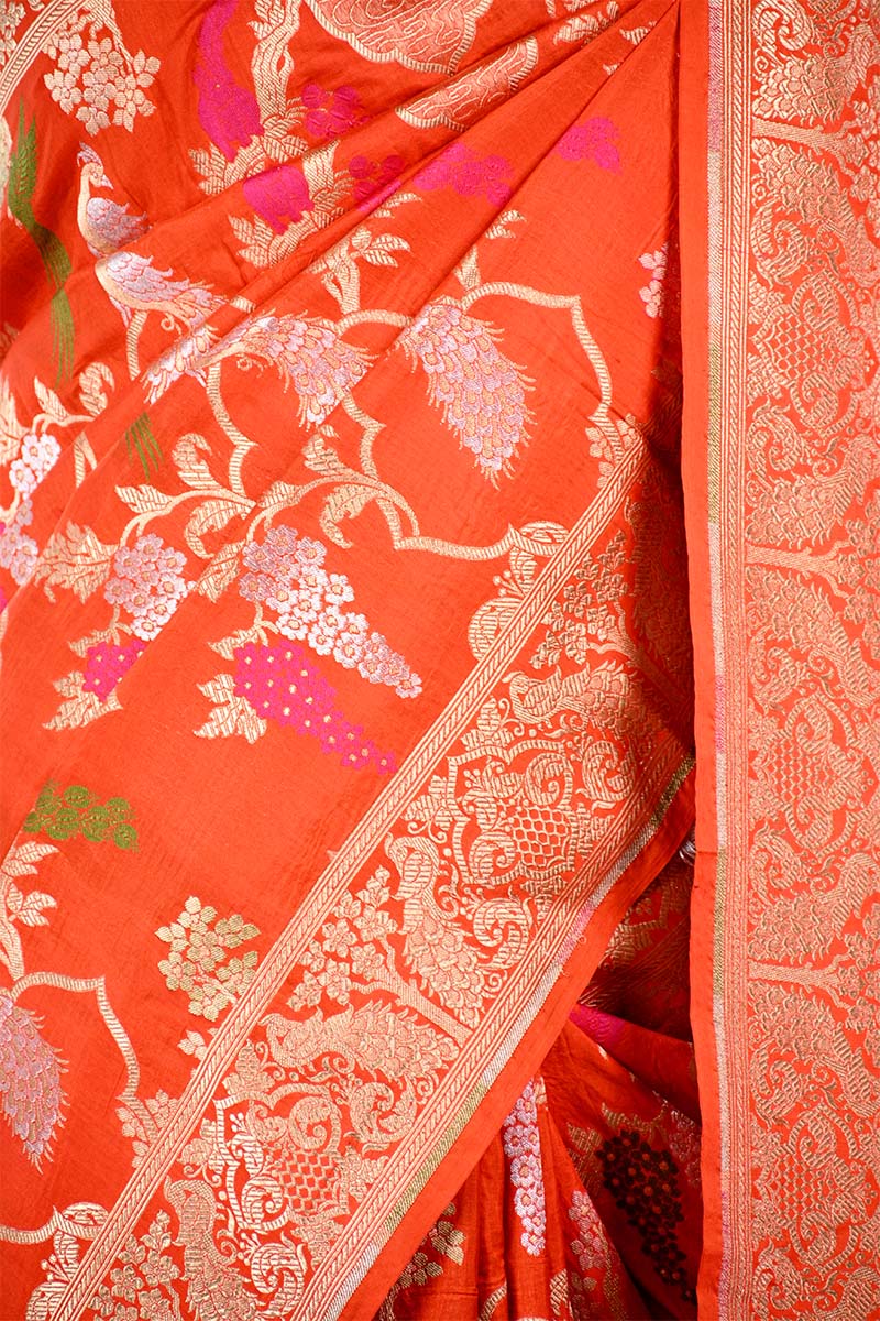 This orange pure Banarasi katan silk saree is delicately designed with nature-inspired peacock, swan and geometrical sona-rupa grapes tree jaal work woven all over the body. The border is intricately designed with peacock and floral zari work, and the pallu has brocade-style woven zari work and complemented by the vertical borders above and below. It is paired with a matching plain unstitched blouse piece finished with a zari woven border.
