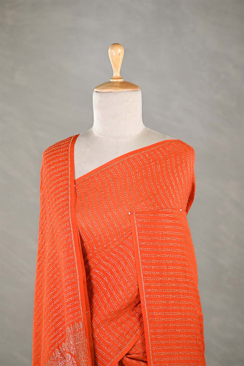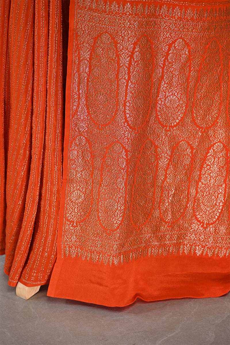 This orange handloom crepe silk saree is adorned with elegant antique zari woven stripes running across the saree, the crepe khaddi base material creating it a refined and traditional look. The saree is complemented by an intricate pallu, adding sophistication to its design. It comes with a matching running blouse piece for custom styling.