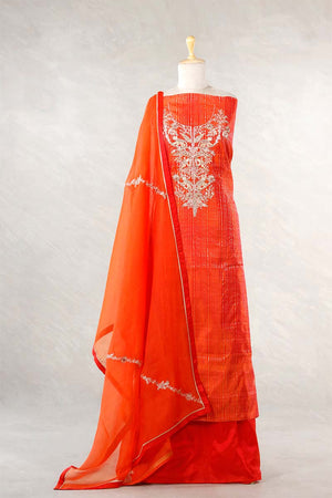 This orange Katan silk suit set is made for festive wear and special functions like a wedding reception. The kurta features a designer neckline highlighted with intricately embellished floral and fauna motifs, and is further detailed with seamless striped gota patti work throughout the body. It is paired with an embellished organza silk dupatta, adorned with zardozi woven embellishments and a lace border. A matching bottom pant completes this coordinated dress material set.
