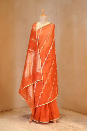 This orange pure organza silk saree features alternating gold and silver zari woven floral slanting stripes across the body. The saree is finished with a gold zari woven brocade pallu and handcrafted lace on the edges for an elegant finish. It comes with a running organza silk blouse piece adorned with gold zari woven stripes for custom stitching.