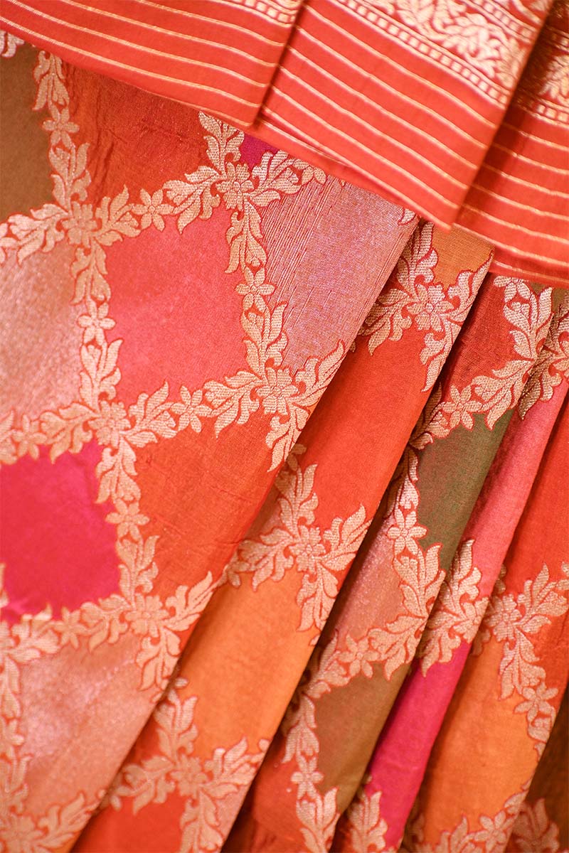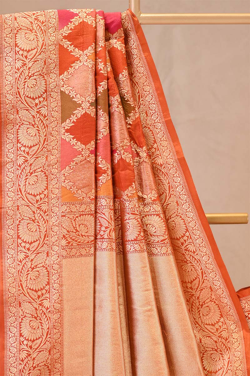 This Orange pure Banarasi katan silk saree is adorned with elegant watergold zari woven geometrical motifs all over the body, beautifully enhanced with traditional rangkat weaving that adds depth and vibrance to its texture. The border and pallu are intricately woven with watergold zari floral motifs. It is paired with a matching Orange blouse piece for a coordinated and graceful look.