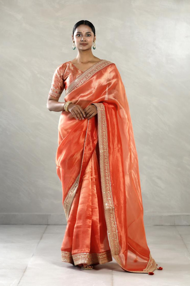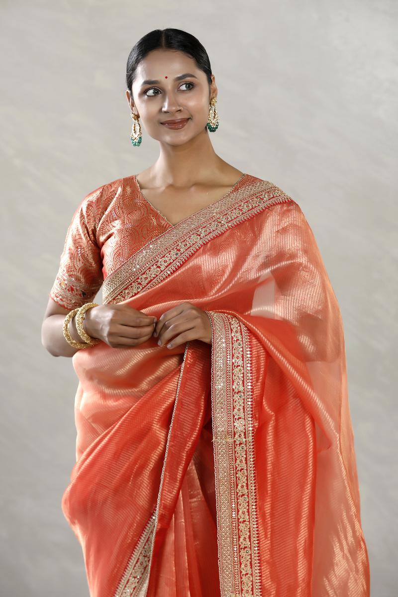 This orange tissue silk saree combines shimmer and craftsmanship with its silver zari-woven stripes running across the entire body. The saree is finished with a delicate embellished lace border that adds a festive edge to its elegant texture. To complete the ensemble, it is paired with a contrast Banarasi silk semi-stitched blouse piece, woven with zari and highlighted with embellishments.