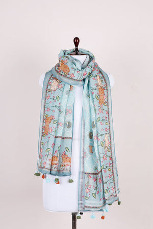 The eye-catching Pale Torquoise Pichwai Printed Linen Dupatta brightens up your look. This fabric has a calming appearance and a traditional look due to the pichwai prints. The dupatta is digitally printed with floral prints and pichwai prints. The contrasting border add more grace to it. Our linen dupatta can be worn with any of your suits to create a stunning and appealing appearance. Wear this dupatta in a unique way for any occasion!