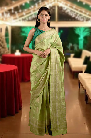 The Banarasi Chiniya Silk is a purely sumptuous and majestic fabric. The beautifully handwoven parrot green saree on the drape will grab your heart and enchant your soul. The uniqueness of these handcrafted chiniya silk sarees adds to your charisma. The saree’s charm magnifies by the use of gold zari buta design all over it, as well as the alluring digital printed dotted pattern. This breathtaking saree would seize the limelight at any casual gathering and make every woman desire for the same!