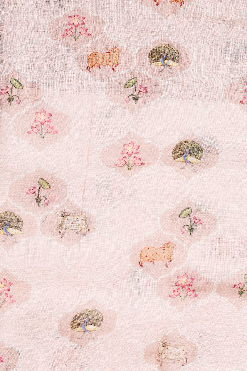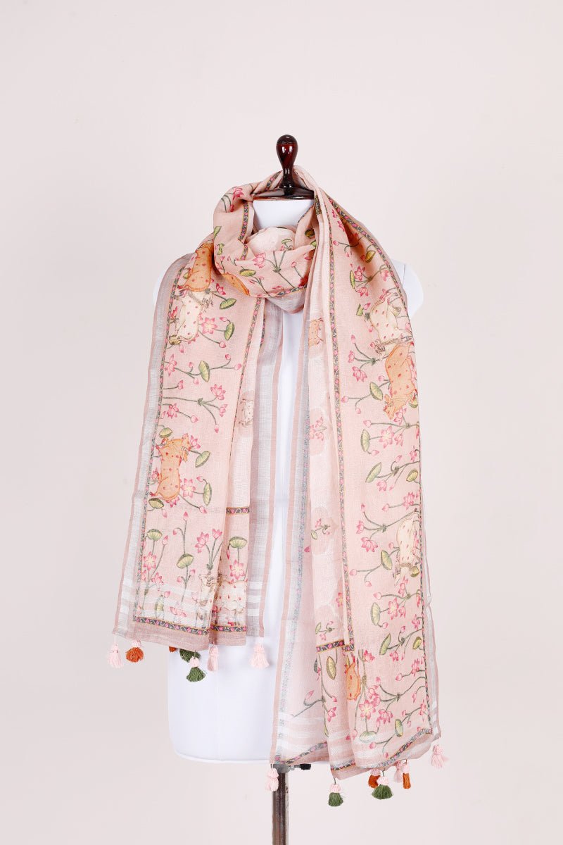 The eye-catching Pastel Peach Pichwai Printed Linen Dupatta brightens up your look. This fabric has a calming appearance and a traditional look due to the pichwai prints. The dupatta is digitally printed with floral prints and pichwai prints. The contrasting border add more grace to it. Our linen dupatta can be worn with any of your suits to create a stunning and appealing appearance. Wear this dupatta in a unique way for any occasion!