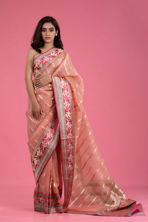 Introducing grace and elegance in our Pastel Peach Handloom Organza Silk Saree. Adorned with exquisite watergold zari ethnic handwoven stripes, it exudes sophistication. The satin silk Meenakari watergold zari ethnic border and pallu elevate its charm. Paired with an unstitched blouse piece, this saree embodies timeless allure, a perfect choice for elegance at any occasion, resonating luxury in every detail.