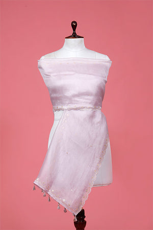 This stunning piece boasts a scalloped border adorned with intricate floral motifs embellished with pitta zari. Its elegance is further enhanced by fancy tassels adorned with delicate beadwork. The entire dupatta is adorned with meticulous beadwork, adding a touch of glamour and sophistication to every ensemble.