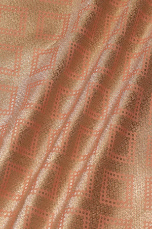 This Peach Banarasi silk fabric features an elegant water gold zari geometrical jaal pattern woven throughout. The sophisticated design makes it an excellent choice for creating a standout blouse or dress.