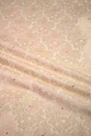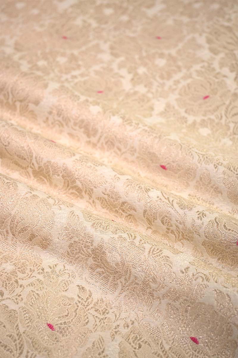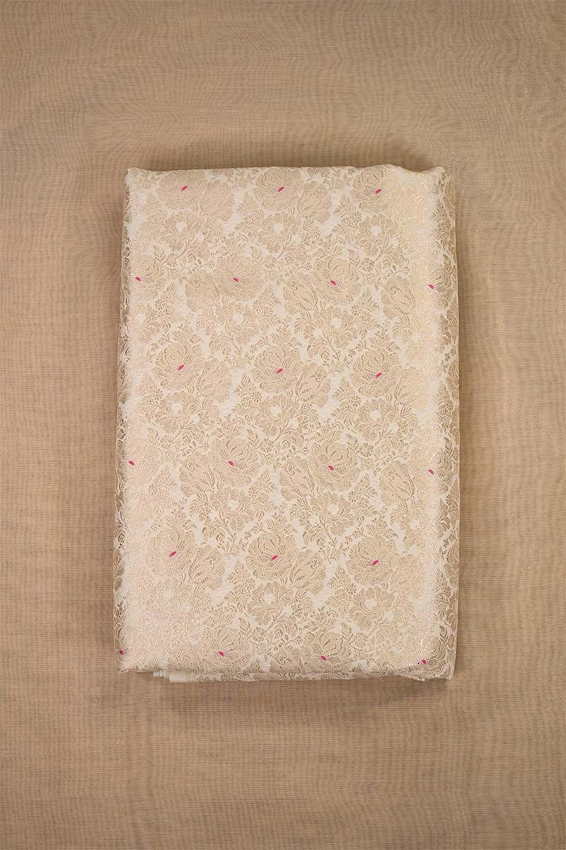 This White Banarasi silk fabric features a golden zari woven rose floral brocade jaal design, beautifully adorned with pink resham meenakari detailing. The combination of floral motifs with meenakari highlights makes it an excellent choice for festive and wedding wear.