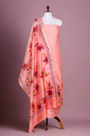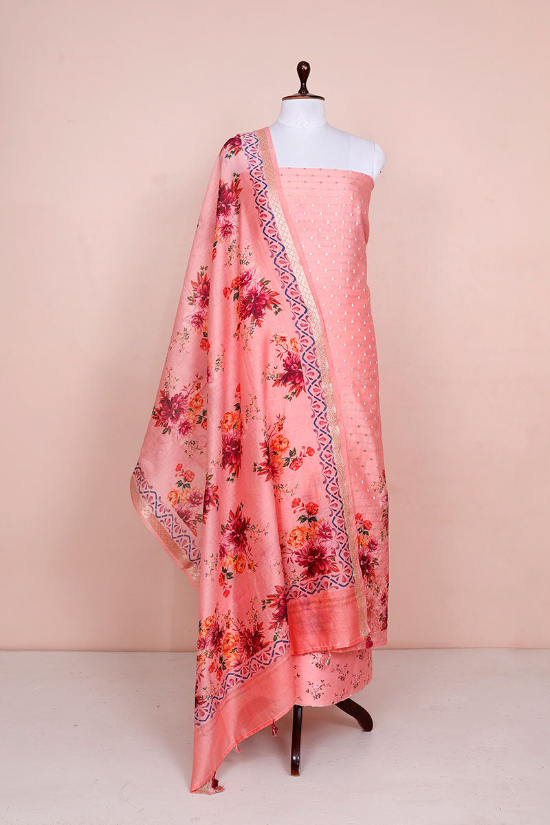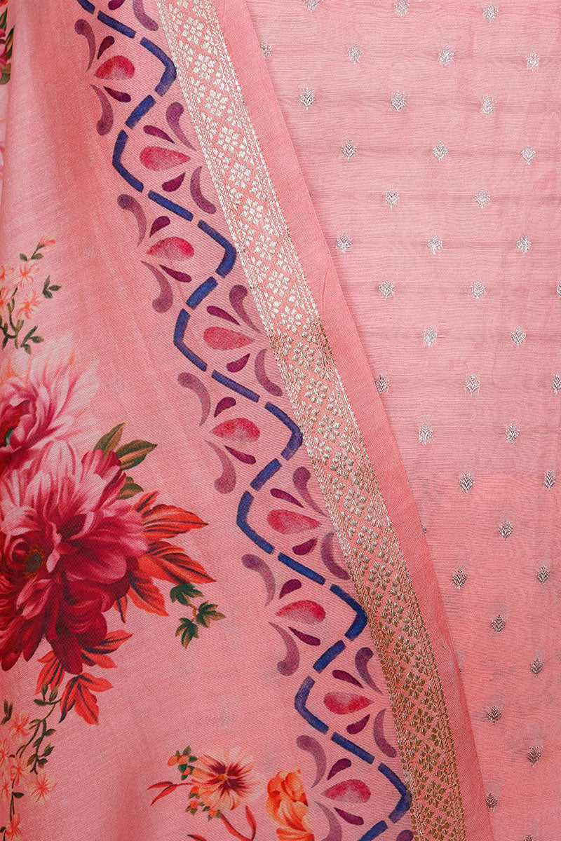Adorn yourself in the exquisite beauty of our digitally printed chanderi silk dress material. Crafted from the finest chanderi silk, this one has stunning silver zari woven small buti all over the kurta fabric with colourful floral digital prints over the border. Accompanied by a matching colourful floral digital printed chanderi dupatta and a subtle floral printed cotton bottom fabric, this one captures the essence of contemporary elegance.