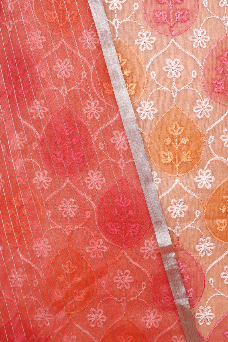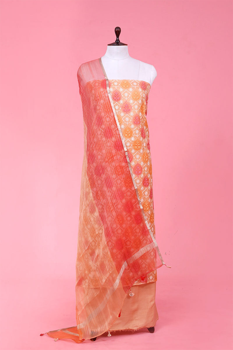 - This Peach Unstitched Suit Set In organza silk fabric.