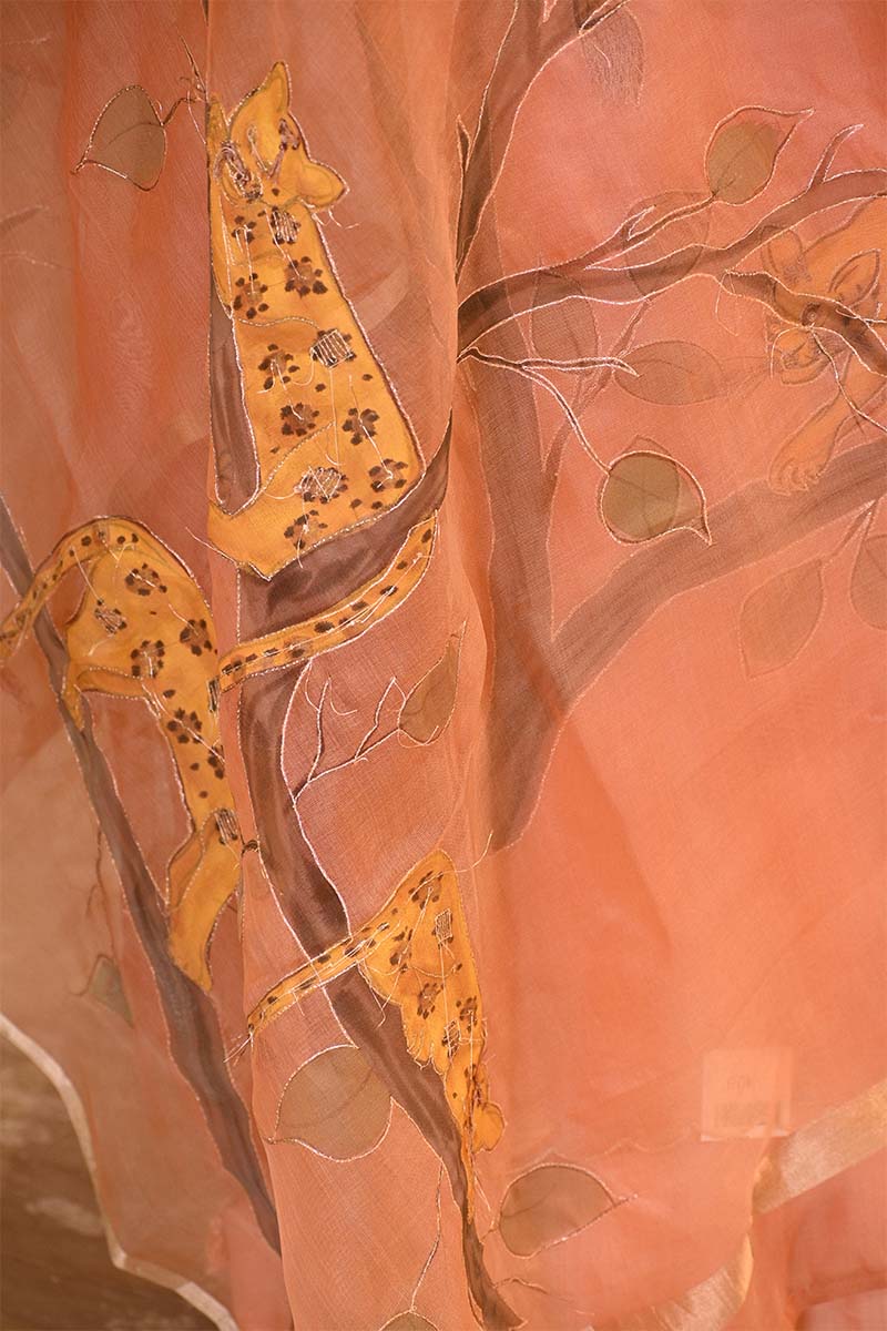 This peach organza silk suit set showcases a beautiful hand-painted tiger-on-trees pattern on the kurta, highlighted with fine aari handwork embellishment to accentuate the artwork. The set is paired with a matching hand-painted organza silk dupatta, also enhanced with delicate aari handwork for a coordinated look. It comes with a matching plain cotton silk bottom fabric for a complete ensemble.