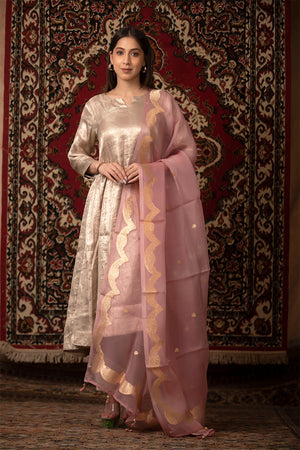 Elevate your ensemble with our handloom organza dupatta, a masterpiece of elegance and tradition. Adorned with intricate gold zari handwoven buti all over, it exudes timeless charm and sophistication. The ethereal beauty is further enhanced by a gold zari handwoven ethnic motif border, adding a touch of regal splendor. Complete with matching tassels, this dupatta is a symbol of refined luxury and impeccable craftsmanship, perfect for adding a touch of grace to any attire.