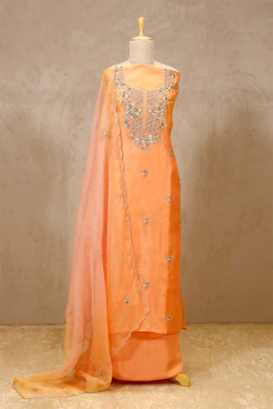 This Peach embellished organza silk dress material is a refined choice for festive and celebratory occasions. The kurta features intricate floral hand embroidery on the U-shaped neckline, further adorned with embellished motifs throughout. Paired with a matching plain silk pant and an embellished organza silk dupatta, the dupatta is highlighted by a scalloped border and hand-embroidered buti detailing, completing the look with grace.