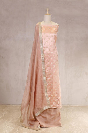 This peach satin silk suit set is a beautiful choice for festive and formal events. The kurta is decorated with water gold zari woven chand buta throughout, adding a touch of detail. Paired with an embellished organza silk dupatta and a comfortable running bottom pant, this set combines tradition with a stylish flair.