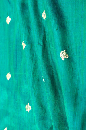 Elevate your ensemble with our Raw Silk Fabric, enriched with exquisite gold zari kadhwa woven buti adorning its surface. Each intricate motif whispers tales of craftsmanship and heritage, adding a touch of opulence to your attire. The fabric's raw silk texture lends a unique charm, while the shimmering gold zari enhances its allure. Perfect for creating statement pieces, this fabric exudes elegance and sophistication, making it ideal for any special occasion.