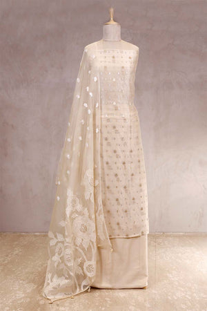 This pearl white organza silk suit set is a classic choice for festive occasions and cultural celebrations. The kurta is adorned with delicate sona rupa buti all over, adding a subtle yet elegant texture. It is paired with an organza silk dupatta featuring intricate appliqué embroidery, and a matching bottom pant completes the ensemble. This dress material offers a sophisticated and timeless look for special events.