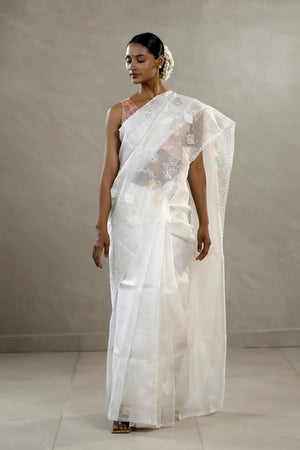 This pearl white pure organza silk saree is adorned with floral motif appliqué work spread across the body and pallu, adding a delicate handcrafted touch. The saree is further accentuated by a scalloped border, enhancing its graceful appeal. It comes with a matching unstitched blouse piece, allowing for personalized styling.