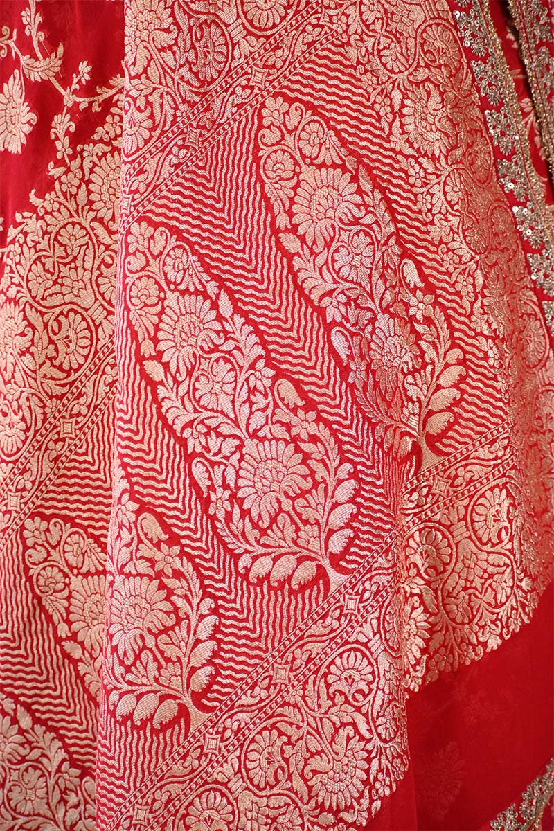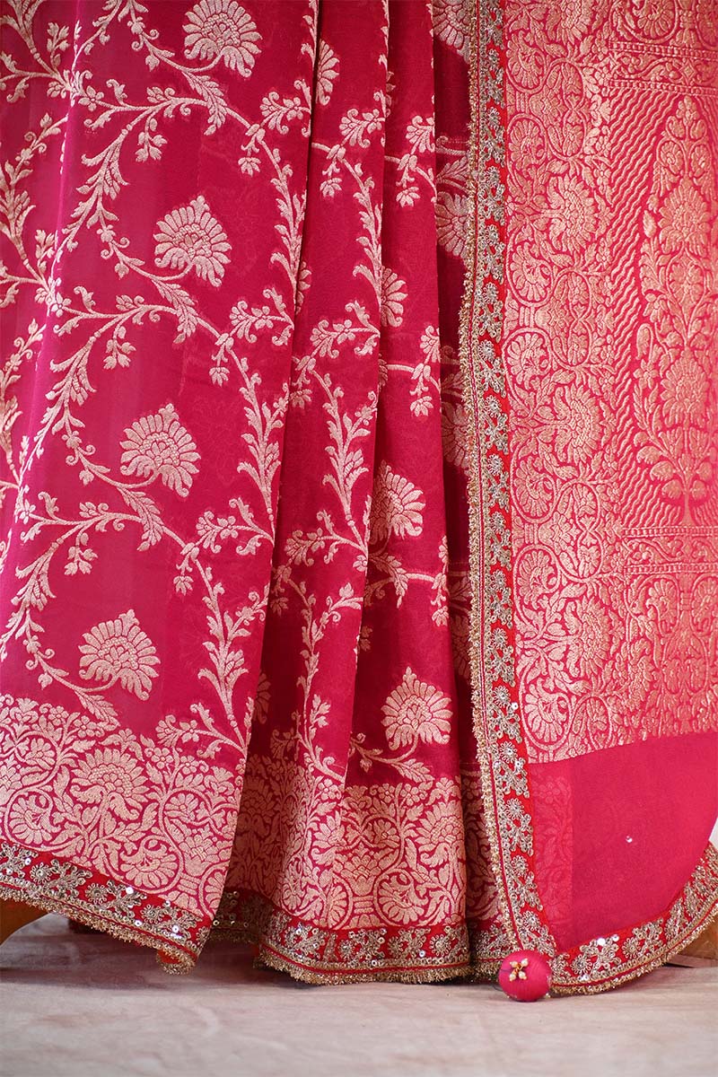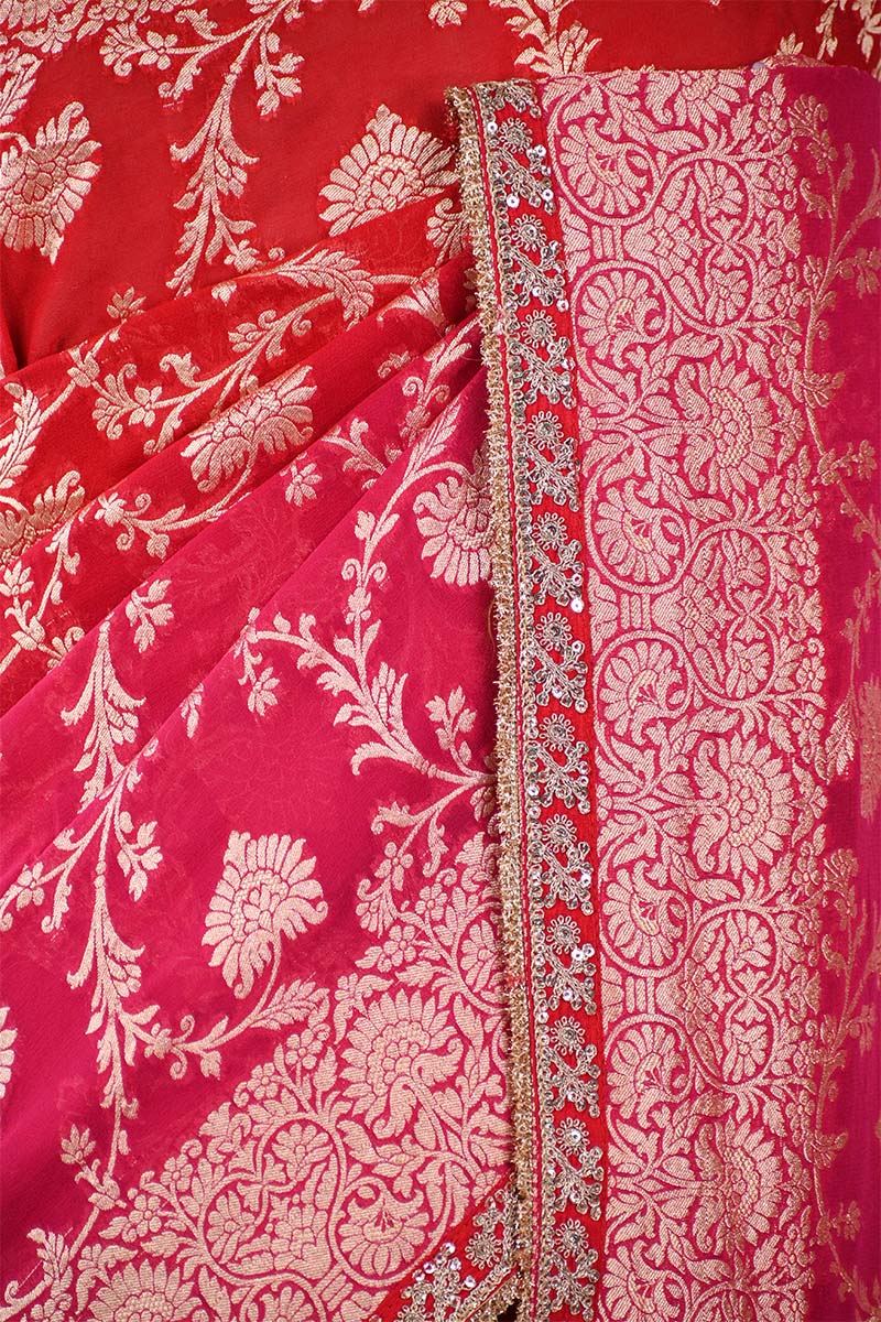 This Pink and Red shaded Pure Georgette Khaddi Silk saree is characterized by its lightweight, crinkled texture and fluid drape. The fabric features a continuous gold zari woven floral jaal pattern throughout the body. The saree edges are finished with attached handcrafted lace on the border. The pallu displays dense gold zari woven floral motifs. It is accompanied by a matching unstitched blouse piece containing zari weaving.