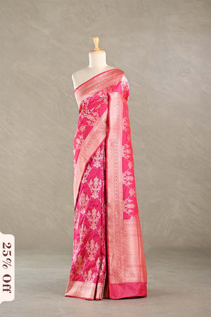 This pink pure Banarasi katan silk saree is adorned with floral gold zari woven ornaments inspired by royal architectural patterns across the body. The border and pallu are decorated with ethnic floral gold zari designs, adding a traditional touch. It is paired with a matching pink unstitched blouse piece finished with a golden zari woven border.