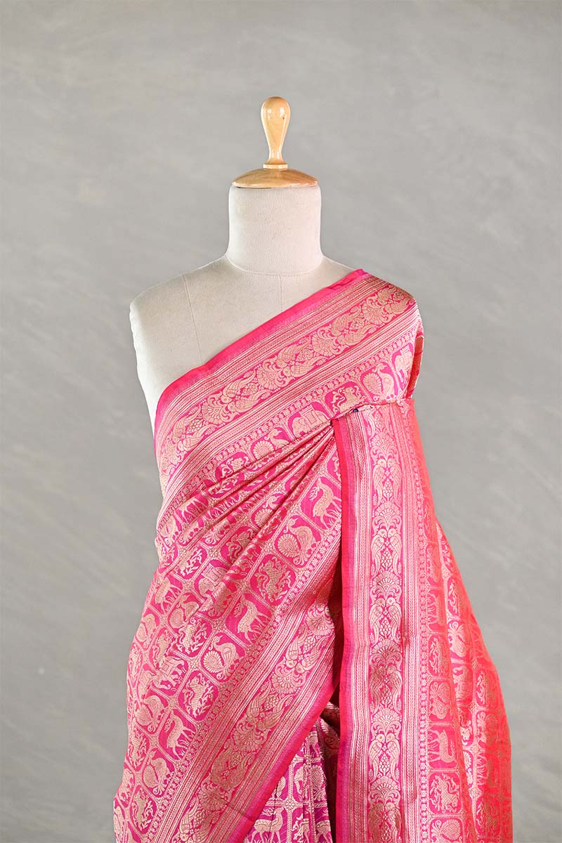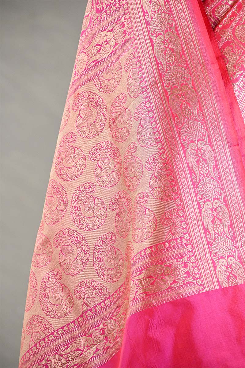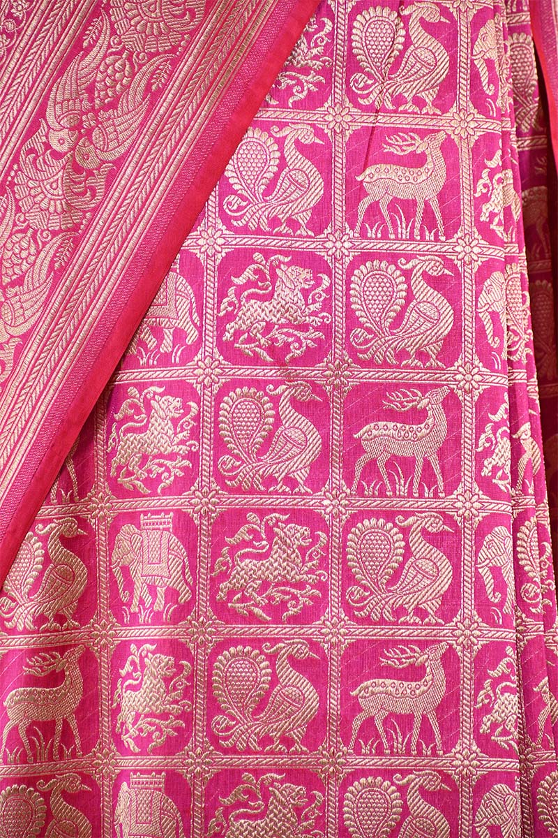 This fuchsia pink color pure Banarasi katan silk saree is woven with an ethnic geometric checkbox pattern, featuring shikargah motifs within the blocks across the body. The border is detailed with zari woven parrots and floral designs, while the pallu carries delicate gold zari paisley and swan motifs. It is paired with a matching unstitched blouse piece finished with a zari woven border.