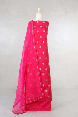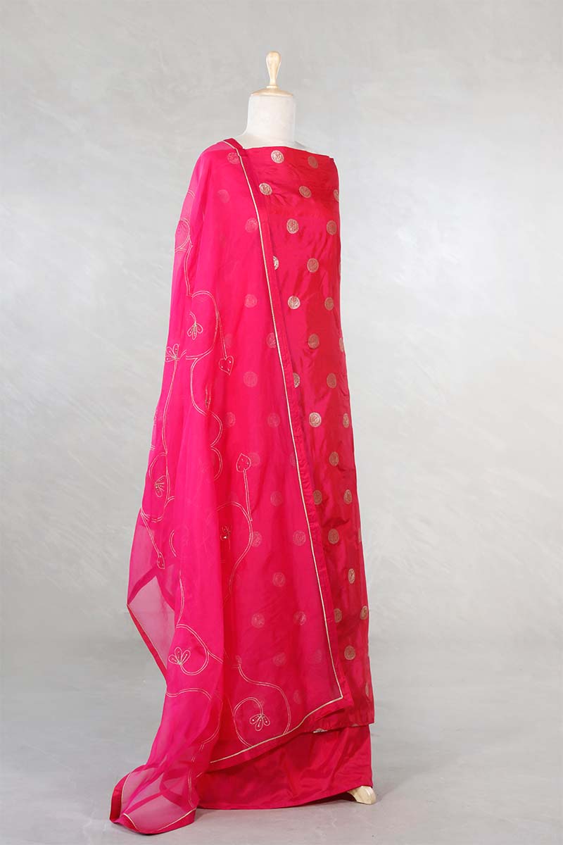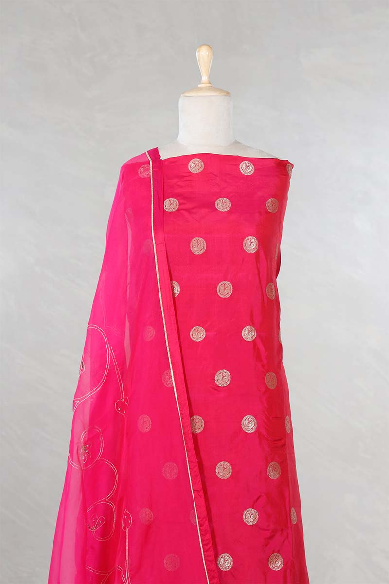 This pink Katan silk suit set is designed for festive occasions and traditional gatherings. The kurta features gold zari woven circular motifs all over, adding detailed patterning to the fabric. It is paired with a plain pink Katan silk bottom pant and a pink organza silk dupatta adorned with leheriya embellishment and a lace border. This coordinated dress material offers a complete ethnic look.