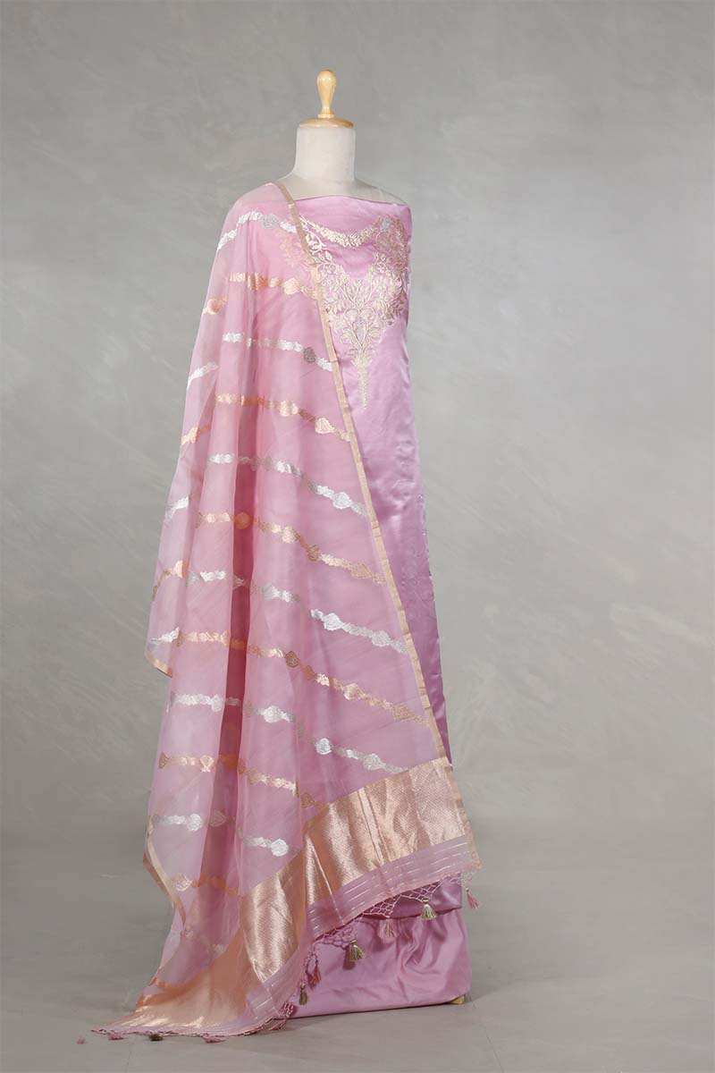 This handloom Pink Banarasi satin silk suit set is an ideal choice for festive occasions and cultural gatherings. The kurta features an intricately handloom Kadhwa woven neck design crafted with water gold zari and silver zari, adding refined detailing. Paired with a plain solid matching bottom fabric and a gold zari woven organza silk dupatta.